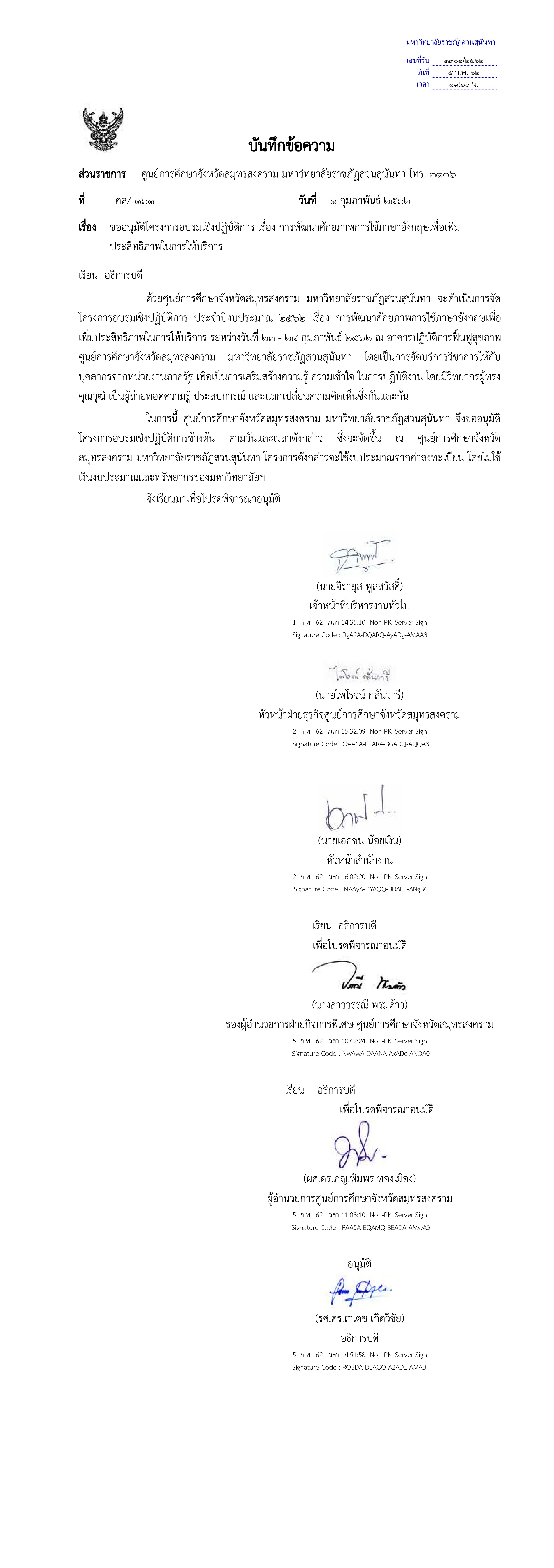 โครงการอบรมเชิงปฏิบัติการ เรื่อง การพัฒนาศักยภาพการใช้ภาษาอังกฤษ เพื่อเพิ่มประสิทธิภาพในการให้บริการ