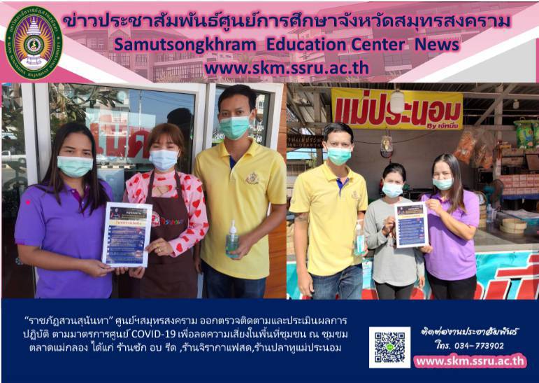 On January 16th, 2021, Asst. Prof. Dr. Pimporn Thongmuang, Acting Director of Samut Songkhram Education Center, Suan Sunandha Rajabhat University, has assigned Ms. Apinya Mukdathanaphong and Mr. Krit Kaewhanam to visit the shops on Ekachai Road, Muang District, Samut Songkhram Province, such as a laundry shop, Jira Coffee Shop, and Mae Pranom Fish Shop. The results of the monitoring showed that every shop has conducted the assessment in accordance with the preventive measures by the government. Consumers were aware of the importance of preventing the spread of COVID-19, while the sellers cleaned the stores at the frequently touched surfaces, provided alcohol gel at the service points, provided hand washing service points, wore a fabric mask or surgical mask, did not provide service to people who did not wear a mask, had access registration points through the Thai Chana application, had a limit on the number of service users, and kept the social distance. In this regard, 9 urgent measures against COVID-19 were promoted to merchants and service recipients by introducing and providing assistance in downloading and using the application system "Mor Chana". The results of the performance were well operated. The sellers were informed and willing to cooperate.