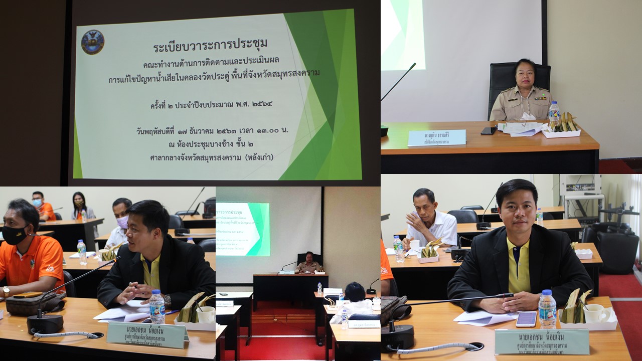 On December 17th, 2020, 01.00 -04.00pm, Mr. Eakkachon Noyngern, Samut Songkhram Education Center, Suan Sunandha Rajabhat University, attended a meeting to solve the problem of wastewater in Pradu Temple canal, Samut Songkhram area, to provide solutions to the problem efficiently. Mrs. Yupin Thamsiri, Statist of Samut Songkhram Province, chaired the meeting of the working team on monitoring and evaluating to solve the wastewater problem at Pradu Temple Canal. A summary of the results of the evaluation was submitted to the chairperson and the Steering Committee, at the Bang Chang Meeting Room, Samut Songkhram City Hall.