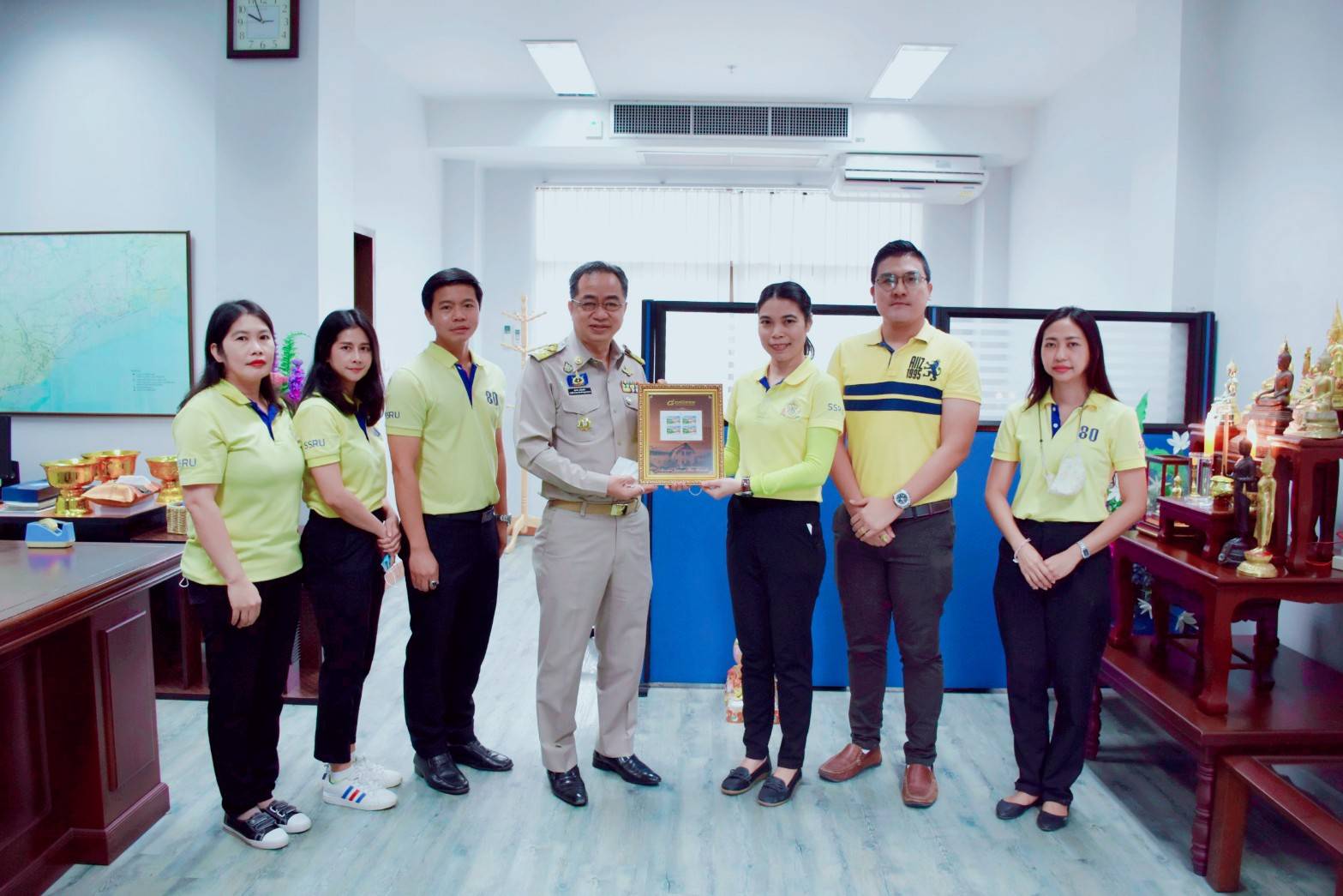 On October 19th, 2020 at 11.30am, Asst. Prof. Dr. Pimporn Thongmuang, Acting Director of Samut Songkhram Education Center, Suan Sunandha Rajabhat University, along with Mr. Eakkachon Noyngern, Chief of the Office, Mr. Jirayus Poolsawat, Acting Chief of Business Department and related personnel, participated in welcoming Mr. Suphot Yossingkham, Deputy Governor of Samut Songkhram Province at the Deputy Governor's Reception Room and gave souvenirs of Suan Sunandha Rajabhat University to congratulate on the opportunity to be promoted in the position of Deputy Governor of Samut Songkhram Province.