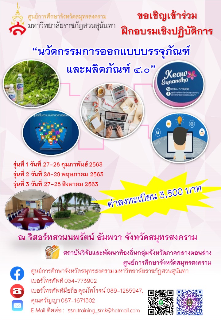 สถาบันวิจัยและพัฒนาท้องถิ่นกลุ่มจังหวัดภาคกลางตอนล่าง ศูนย์การศึกษาจังหวัดสมุทรสงคราม มหาวิทยาลัยราชภัฏสวนสุนันทา ขอเชิญผู้ที่สนใจ เข้าร่วมโครงการฝึกอบรมเชิงปฏิบัติการ