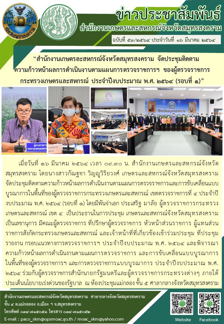 > "สำนักงานเกษตรละสหกรณ์จังหวัดสมุทรสงคราม จัดประชุมติดตาม ความก้าวหน้าผลการดำเนินงานตามแผนการตรวจราชการฯ ของผู้ตรวจราชการ กระทรวงเกษตรและสหกรณ์ ประจำปีงบประมาณ พ.ศ. ๒๕๖๔ (รอบที่ ๑)"