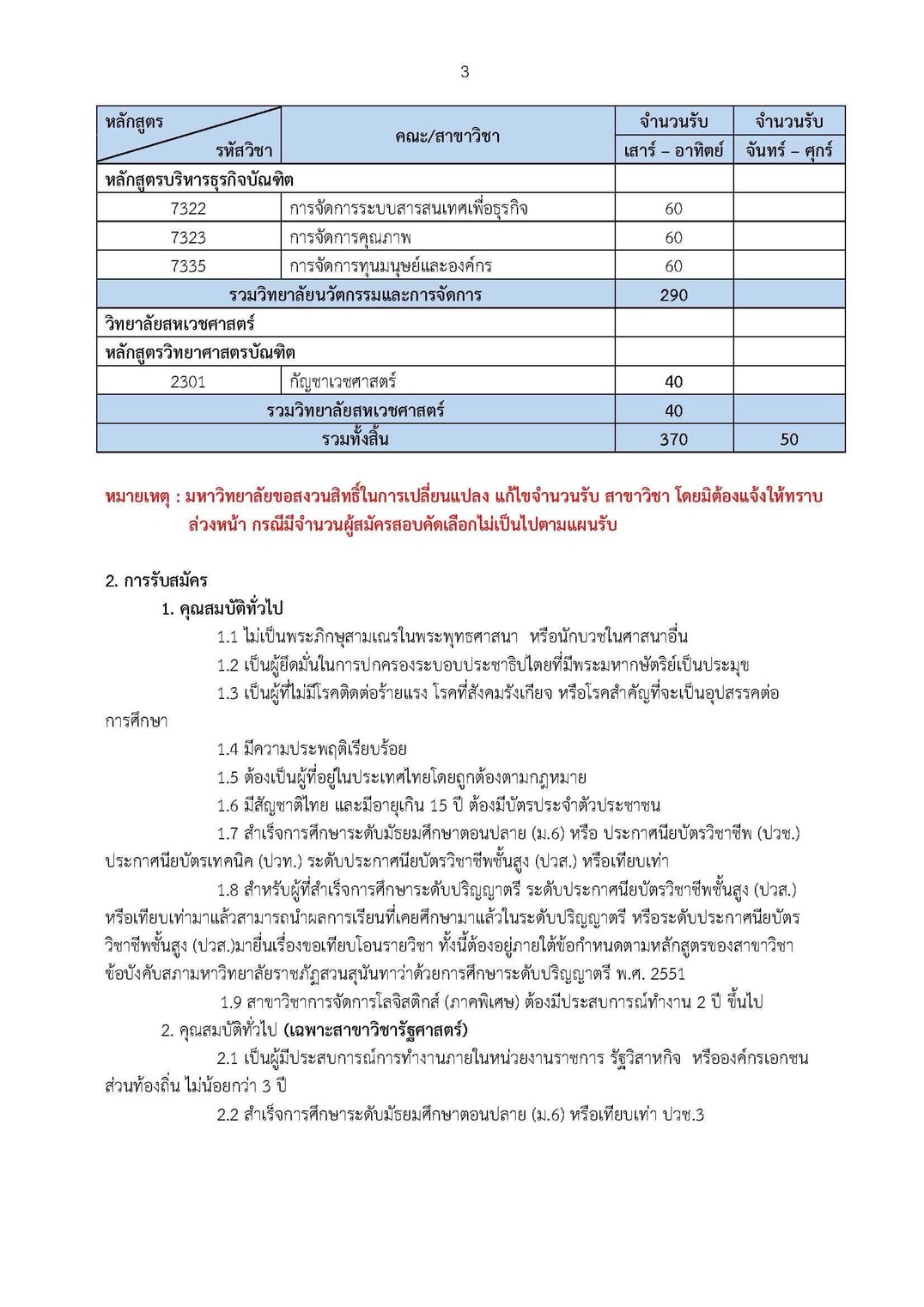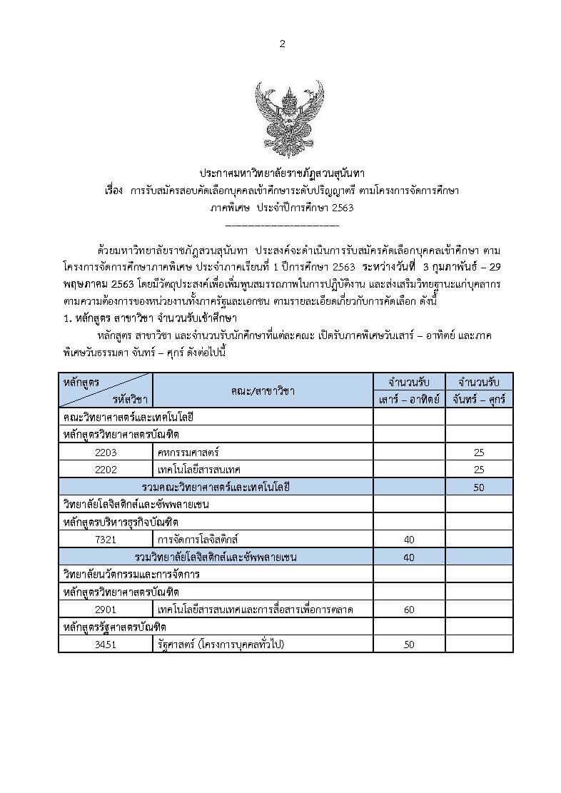 มหาวิทยาลัยราชภัฏสวนสุนันทา เปิดรับสมัครสอบคัดเลือกนักศึกษา ระดับปริญญาตรี โครงการจัดการศึกษาภาคพิเศษ ประจำปีการศึกษา 2563 ตั้งแต่วันที่ 3 กุมภาพันธ์ 2563 - วันที่ 29 พฤษภาคม 2563 โดยสมัคทาง www.admission.ssru.ac.th สอบถามรายละเอียดเพิ่มเติมได้ที่ฝ่ายประชาสัมพันธ์ และฝ่ายรับเข้าศึกษา มหาวิทยาลัยราขภัฏสวนสุนันทา โทรศัพท์ 021601000 021601023 021601400 และ 021601380 www.ssru.ac.th