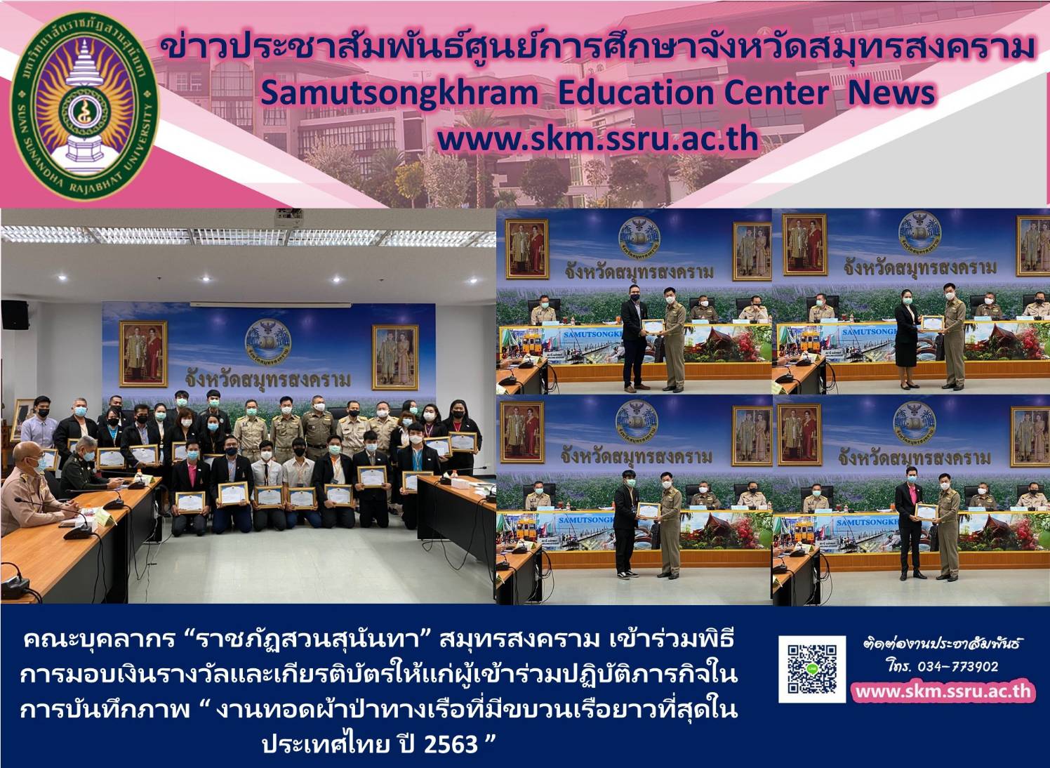On January 27th, 2021 at 09.30am, Mr. Jirayus Poonsawat, Acting Chief of Business Department, Ms. Apinya Mukdathanaphong, Mr. Sathira Nokinsee, and Mr. Krit Kaewhanam, Samut Songkhram Education Center personnel, Suan Sunandha Rajabhat University participated in the ceremony to give money, awards and certificates to participants in the mission to record "The Longest Boat Parade Ceremony in Thailand 2020", a project to promote and support water tourism in Samut Songkhram Province. It was also a merit making ceremony to set up a fund of "Mae Klong Lovers Community", which organized a project activity on December 3rd, 2020. Mr. Charas Bunnasa, Samut Songkhram Provincial Governor presided over the awarding ceremony in this recording mission at Mae Klong Meeting Room, 5th Floor, Samut Songkhram City Hall.