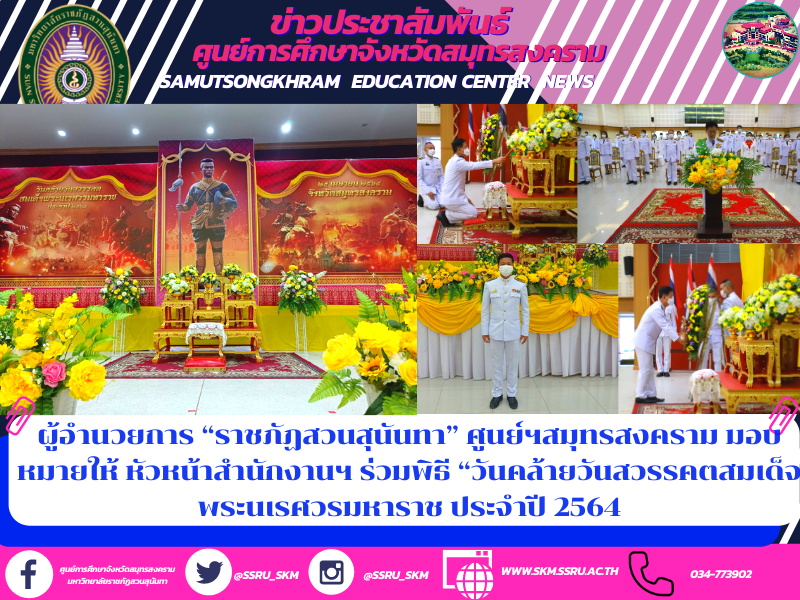วันนี้ (25 เม.ย.64) ผู้ช่วยศาสตร์จารย์ ดร.ภญ.พิมพร ทองเมือง ผู้อำนวยการศูนย์การศึกษาจังหวัดสมุทรสงคราม มหาวิทยาลัยราชภัฏสวนสุนันทา มอบหมายให้นายเอกชน น้อยเงิน หัวหน้าสำนักงานฯ เข้า ร่วมพิธี “วันคล้ายวันสวรรคตสมเด็จพระนเรศวรมหาราช ประจำปี 2564 โดยมีนายชรัส บุญณสะ ผู้ว่าราชการจังหวัดสมุทรสงคราม เป็นประธานในพิธี โดยมีข้าราชการพลเรือน ตุลาการ อัยการ ทหาร ตำรวจ พนักงานรัฐวิสาหกิจ องค์กรปกครองส่วนท้องถิ่น ในจังหวัดสมุทรสงคราม เข้าร่วมพิธีฯ