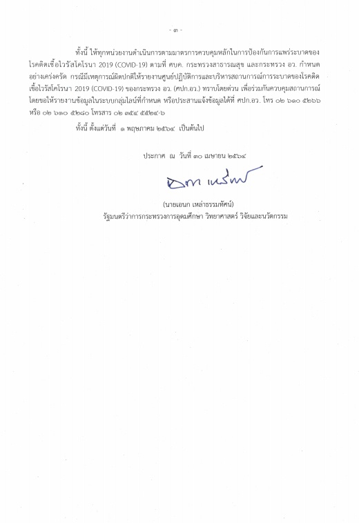 > ประกาศ กระทรวงการอุดมศึกษา วิทยาศาสตร์ วิจัยและนวัตกรรม เรื่องมาตรการและการเฝ้าระวังการระบาดของโรคติดเชื้อไวรัสโคโรนา ๒๐๑๙ (COVID-19) (ฉบับที่ ๑๒)