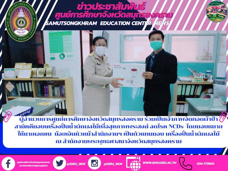 วันนี้ (29 มี.ค.64) ผู้ช่วยศาสตราจารย์ ดร.ภญ.พิมพร ทองเมือง ผู้อำนวยการศูนย์การศึกษาจังหวัดสมุทรสงคราม มหาวิทยาลัยราชภัฏสวนสุนันทา มอบหมาย นายเอกชน น้อยเงิน หัวหน้าสำนักงานศูนย์ฯ เพื่อเข้าพบ นางสาวมาลินี สวยค้าข้าว ผู้อำนวยการสำนักงานพระพุทธศาสนาจังหวัดสมุทรสงคราม เพื่อร่วมเป็นเจ้าภาพร่วมบริจาคเครื่องปั่นน้ำผักผลไม้ แด่พระภิกษุสงฆ์ ตามโครงการทอดผ้าป่าสามัคคีเพื่อสุขภาพพระสงฆ์ ลดโรค NCDs ของนายชรัส บุญณสะ ผู้ว่าราชการจังหวัดสมุทรสงคราม โดยมีวัตถุประสงค์เพื่อเป็นการรักษาสุขภาพพระสงฆ์ที่ส่วนใหญ่พบปัญหาฆราวาสถวายอาหารใส่บาตรพระสงฆ์ เป็นอาหารหวาน มัน เค็ม ทำให้มีการอัตราของผู้ป่วย มีจำนวนสูงขึ้น สาเหตุมาจากการเกิดโรคหลอดเลือดสมอง รองลงมาคือโรคหัวใจขาดเลือด โรคทางเดินหายใจอุดกั้นเรื้อรัง เบาหวาน และความดันโลหิต และเพื่อเป็นการรักษาสุขภาพพระสงฆ์ทั้งจังหวัด จำนวน 113 วัด ให้ได้ฉันน้ำผัก ผลไม้ ปั่นอย่างสม่ำเสมอ ลดความเสี่ยงของการเกิดโรค NCDs จึงมีความแนวคิดให้ทุกคนมีส่วนร่วมในการทำบุญในครั้งนี้ ด้วยการจัดโครงการทอดผ้าป่าสามัคคีจัดซื้อเครื่องปั่นน้ำผักผลไม้ ขึ้นมอบให้เจ้าอาวาสทุกวัด