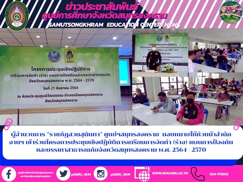 วันนี้ (21 ก.ย.64) ผู้ช่วยศาสตร์ ดร.ภญ.พิมพร ทองเมือง ผู้อำนวยการศูนย์การศึกษาจังหวัดสมุทรสงคราม มหาวิทยาลัยราชภัฏสวนสุนันทา มอบหมายให้นายเอกชน น้อยเงิน หัวหน้าสำนักงานฯ เข้าร่วม ประชุมเชิงปฏิบัติการเตรียมการจัดทำร่างแผนการป้องกันและบรรเทาสาธารณภัยจังหวัดสมุทรสงครามโดยมีพันเอก จิระโรจน์ กองวารี รองผู้อำนวยการรักษาความมั่นคงภายในจังหวัดสมุทรสงคราม เป็นประธานการ พร้อมด้วยนายจาตุรงค์ สุขพัฒน์ หัวหน้าสำนักงานป้องกันและบรรเทาสาธารณภัยจังหวัดสมุทรสงคราม กล่าวรายงานวัตถุประสงค์ และส่วนราชการ หน่วยงานที่เกี่ยวข้องจากภาครัฐและท้องถิ่นเข้าร่วมประชุมเชิงปฏิบัติการเนื่องจากปัจจุบันสถานการณ์สาธารณภัยของโลกและของประเทศไทยมีความรุนแรงและซับซ้อนมากขึ้น รวมทั้งภัยคุกคามรูปแบบใหม่ เช่น ภัยจากมลพิษทางอากาศ PM 2.5 และโรคอุบัติใหม่ต่างๆ ซึ่งสร้างความเสียหายต่อชีวิตและทรัพย์สินของประชาชน ส่งผลกระทบต่อระบบเศรษฐกิจ สังคม สิ่งแวดล้อม และการพัฒนาประเทศ อีกทั้งพระราชบัญญัติป้องกันและบรรเทาสาธารณภัย พ.ศ. 2550 ได้กำหนดให้มีการปรับปรุงแผนการป้องกันและบรรเทาสาธารณภัยแห่งชาติให้สอดคล้องกับสถานการณ์การเกิดสาธารณภัยที่เปลี่ยนแปลงไปในปัจจุบัน กรมป้องกันและบรรเทาสาธารณภัย ในฐานะหน่วยงานที่รับผิดชอบจึงได้จัดทำร่างแผนการป้องกันและบรรเทาสาธารณภัยแห่งชาติ พ.ศ. 2564 – 2570 เพื่อเสนอคณะกรรมการป้องกันและบรรเทาสาธารณภัยแห่งชาติให้ความเห็นชอบ ก่อนเสนอคณะรัฐมนตรีพิจารณาอนุมัติซึ่งปัจจุบันอยู่ระหว่างเสนอคณะรัฐมนตรี นอกจากนี้ตามพระราชบัญญัติป้องกันและบรรเทาสาธารณภัย พ.ศ. 2550 ยังกำหนดให้การจัดทำแผนการป้องกันและบรรเทาสาธารณภัยจังหวัดต้องสอดคล้องกับแผนแห่งชาติ และให้ผู้มีหน้าที่รับผิดชอบปรับปรุงหรือทบทวนแผนในกรณีที่ข้อเท็จจริงเปลี่ยนแปลงไปหรือใช้แผนครบ 5 ปีแล้ว