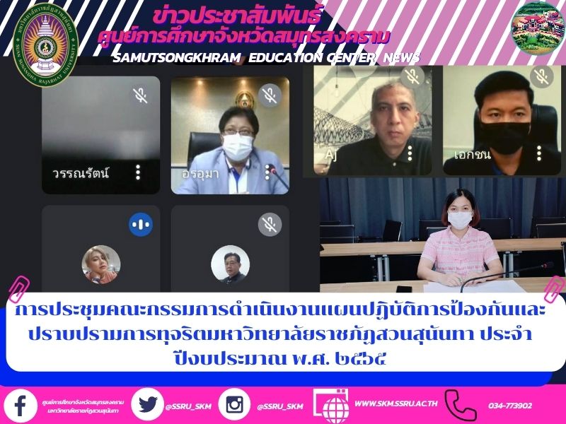 วันที่ 21 กันยายน 2564 นายเอกชน น้อยเงิน หัวหน้าสำนักงานศูนย์การศึกษาจังหวัดสมุทรสงคราม มหาวิทยาลัยราชภัฏสวนสุนันทา พร้อมด้วยนางสาวพัชรา แสงนวล เจ้าหน้าที่บริหารงานทั่วไป เข้าร่วมประชุมคณะกรรมการจัดทำแผนปฏิบัติการด้านการปรับปรุงภูมิทัศน์และสิ่งแวดล้อมระดับมหาวิทยาลัย ระยะ 5 ปี (พ.ศ.2565-2569) และประจำปีงบประมาณ พ.ศ.2565 และแผนปฏิบัติการด้านการป้องกันและปราบปรามการทุจริต ประจำปีงบประมาณปี พ.ศ.2565 ซึ่งได้รับเกียรติจาก ผู้ช่วยศาสตราจารย์ ดร.ปรีชา พงษ์เพ็ง รองอธิการบดีฝ่ายบริหาร มหาวิทยาลัยราชภัฏสวนสุนันทา เป็นประธานการประชุม มีผู้บริหาร หัวหน้าฝ่าย ประจำหน่วยงาน วิทยาลัย คณะ เข้าร่วมประชุม ผ่านระบบออนไลน์ Google Meet