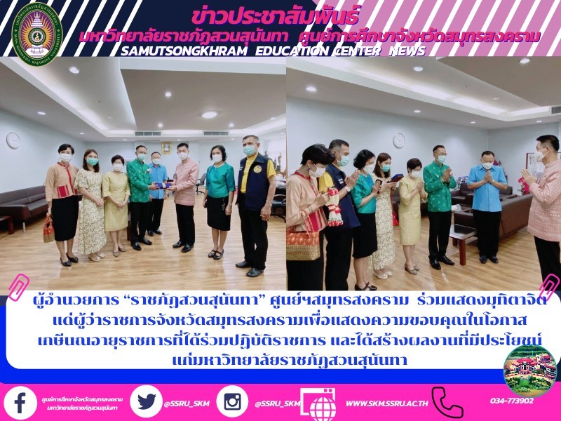 > ผู้อำนวยการ “ราชภัฏสวนสุนันทา” ศูนย์ฯสมุทรสงคราม ร่วมแสดงมุทิตาจิต แด่ผู้ว่าราชการจังหวัดสมุทรสงครามเพื่อแสดงความขอบคุณในโอกาส เกษีนณอายุราชการที่ได้ร่วมปฏิบัติราชการ และได้สร้างผลงานที่มีประโยชน์ แก่มหาวิทยาลัยราชภัฏสวนสุนันทา
