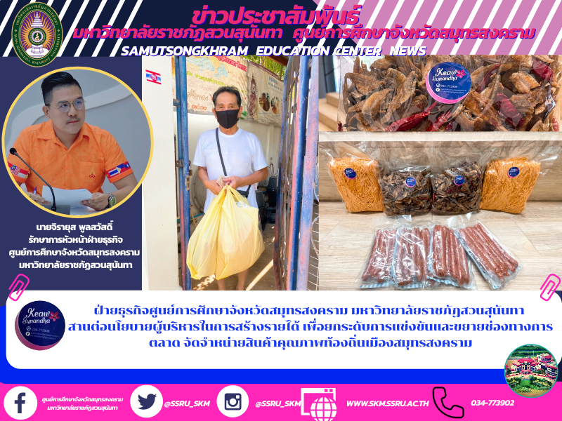 วันที่ 27 กันยายน 2564 เวลา 09.00 น. นายจิรายุส พูลสวัสดิ์ รักษาการหัวหน้าฝ่ายธุรกิจศูนย์การศึกษาจังหวัดสมุทรสงคราม มหาวิทยาลัยราชภัฏสวนสุนันทา จัดแคมเปญการตลาดบริหารนำส่งอาหารทะเลให้แก่ลูกค้าถึงหน้าบ้าน สานต่อนโยบายผู้บริหารในการสร้างรายได้ เพื่อยกระดับการแข่งขันและขยายช่องทางการตลาด จัดจำหน่ายสินค้าคุณภาพท้องถิ่นเมืองสมุทรสงคราม