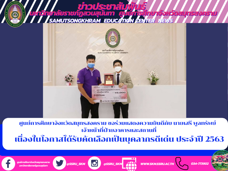 ศูนย์การศึกษาจังหวัดสมุทรสงคราม ขอร่วมแสดงความยินดีกับ นายเสรี พูลทรัพย์ เจ้าหน้าที่ฝ่ายอาคารและสถานที่ เนื่องในโอกาสได้รับคัดเลือกเป็นบุคลากรดีเด่น ประจำปี 2563