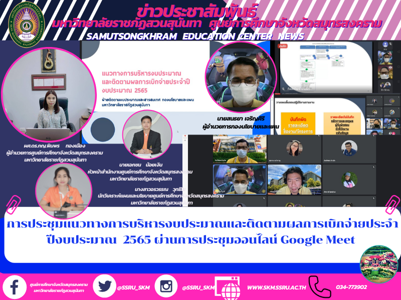 On 4 October, 2021 at 09.00 hr., Asst. Prof. Dr. Pimporn Thongmuang, Director of Samut Songkhram Education Center, Suan Sunandha Rajabhat University, along with Mr. Eakkachon Noyngern, Chief of Samut Songkhram Education Center Office and Ms. Orawan Wuthicho, Plan and Policy Analyst participated in the online budget management guidelines meeting and follow up on disbursement results for the fiscal year 2022 via the Google Meet organized by Budget and Information Monitoring Department, Policy and Planning Division to clarify to the agencies within the university to know the guidelines and practices in budget management and follow-up on disbursement results while Mr. Sonthaya Charoensiri, Director of the Policy and Planning Division presided over the meeting