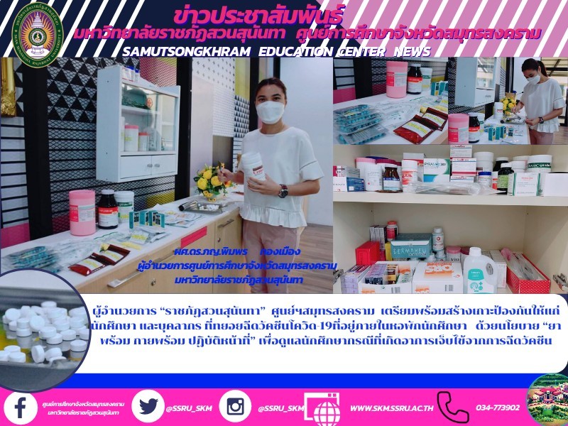 On 5 October, 2021 at 13.30 hr., Asst. Prof. Dr. Pimporn Thongmuang, Director of Samut Songkhram Education Center, Suan Sunandha Rajabhat University prepared to build a protective measure for students and personnel who gradually vaccinate against COVID-19 within the student dormitory with the policy of "Medicine and Health are Ready for Operation" to take care of students in case of sickness from vaccination with home remedies under the supervision and control by the Director of the Education Center.