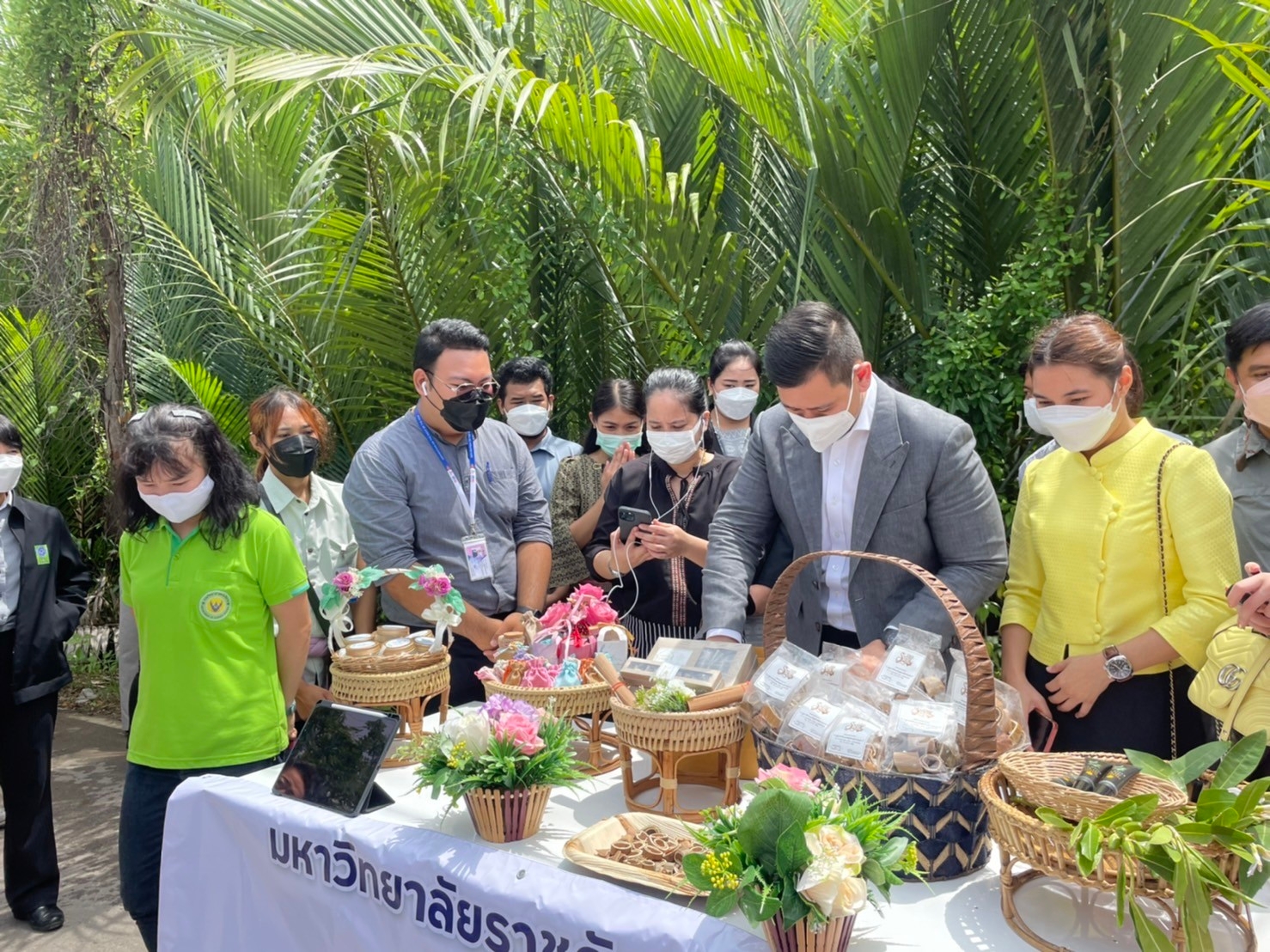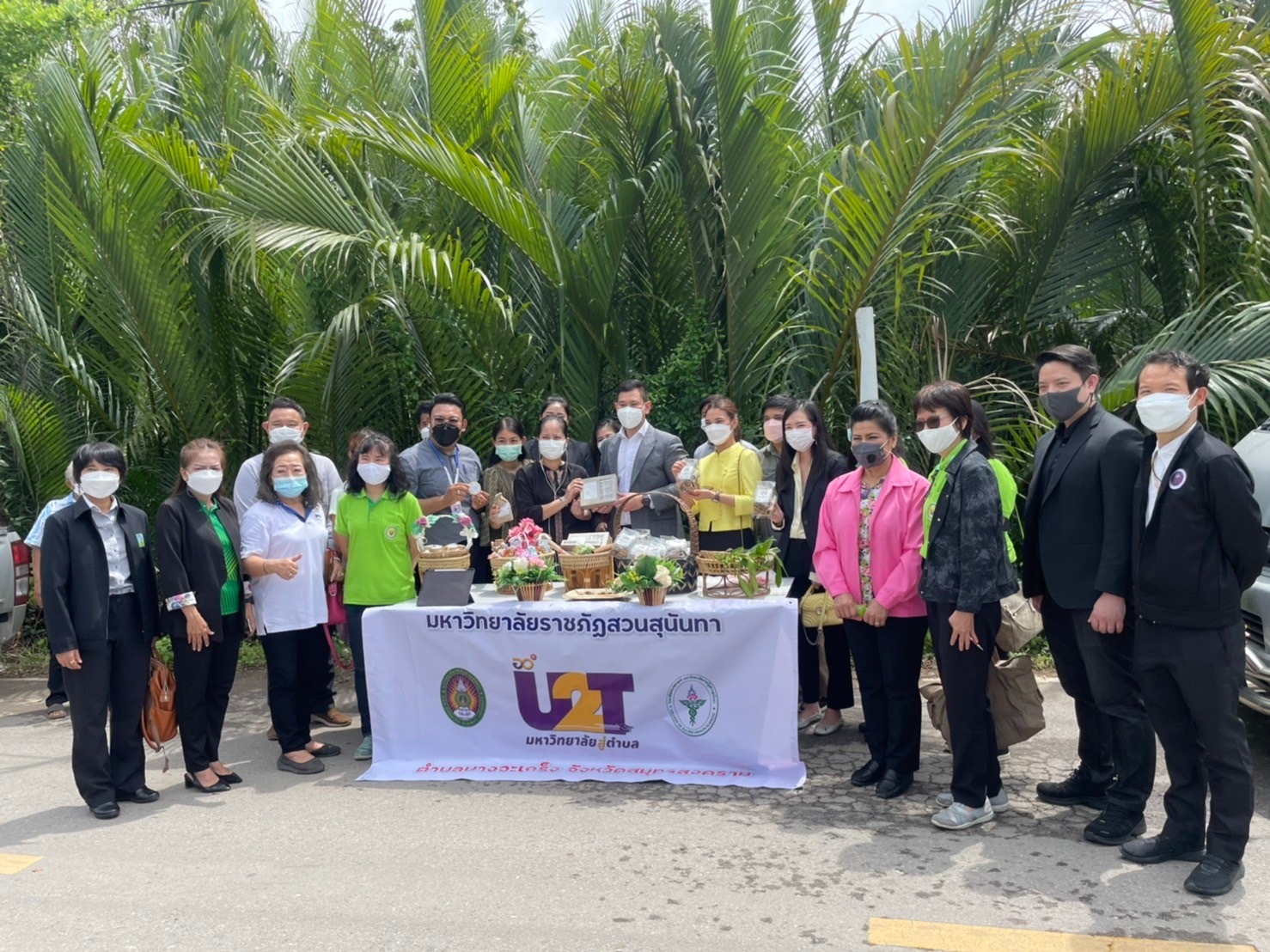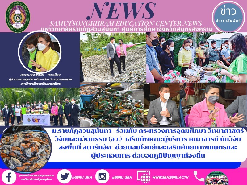 On 6 October, 2021 at 09.00 hr., Suan Sunandha Rajabhat University led by Assoc. Prof. Dr. Chutikarn Srivibul, President of Suan Sunandha Rajabhat University and Asst. Prof. Dr. Suwaree Yodchim, Vice President for Research and Development as an operating unit for the front line of Samut Songkhram Province assigned Asst. Prof. Dr. Pimporn Thongmuang, Director of Samut Songkhram Education Center, Assoc. Prof. Dr. Rotchana Chantrasa, Director of Research and Development Institute, Suan Sunandha Rajabhat University, Ajarn Dr. Wat Ploysri, Deputy Director for Academic Services, Instructors and staff of U2T Project, College of Allied Health Sciences, Mr. Eakkachon Noyngern, Chief of the Office, and the Local Lower Central Province Research and Development Institute to visit the area with the Ministry of Higher Education, Science, Research and Innovation to meet entrepreneurs in the seafood processing group, Laem Yai Subdistrict, Mueang District, Samut Songkhram Province. Asst. Prof. Dr. Duangrit Benjathikul Chairungruang, Secretary to the Minister of Higher Education, Science, Research and Innovation led the team of executives, researchers, and related agencies to the area while Ms. Rangsima Rodrassamee, Member of the House of Representatives, Samut Songkhram Province welcomed and discussed ways to promote and drive entrepreneurs to produce products that meet quality standards and to bring together scientific expertise to push entrepreneurs into the standardization process, to create jobs, to generate income, to enable communities to be self-reliant and to promote sustainable economic development from the foundation level.
