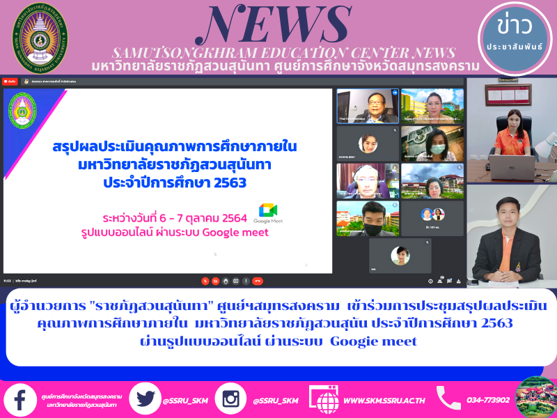 On 6 October, 2021, Asst. Prof. Dr. Pimporn Thongmuang, Director of Samut Songkhram Education Center, Suan Sunandha Rajabhat University along with Mr. Eakkachon Noyngern, Chief of the Office attended the online meeting to summarize the results of the internal educational quality assessment, Suan Sunan Rajabhat University, academic year 2020 via Google Meet. Assoc. Prof. Dr. Chutikarn Srivibul, the President, together with Assoc. Prof. Dr. Wittaya Mekkham, Vice President for Planning and Quality Assurance led the management team and related parties to welcome the Internal Education Quality Assessment Committee, Suan Sunandha Rajabhat University for the academic year 2020 while Assoc. Prof. Dr. Thai Thipsuwankul was the Chair of the Audit Committee.