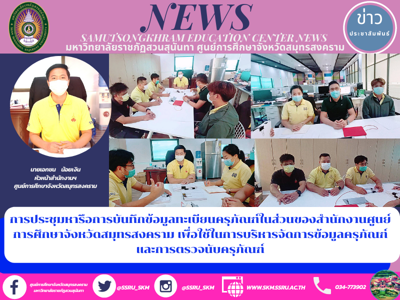 On 10 October, 2021 at 09.30 hr., Mr. Eakkachon Noyngern, Chief of Samut Songkhram Education Center Office, Suan Sunandha Rajabhat University attended the meeting to discuss with the equipment inspection and monitoring committee about processes, methods, and management related to supplies and recording the information of the warehouse registration in the part of the office for the management of equipment information and annual equipment counting. There were related workers attending the meeting at the office room on the 5th floor of the Rehabilitation Building, Samut Songkhram Education Center.