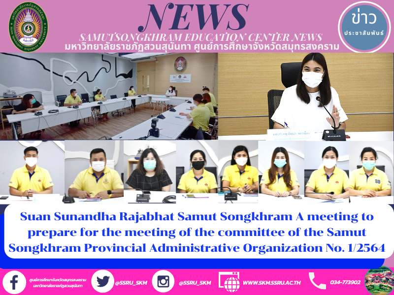 On 25 October 2021 at 10.00 hr., Samut Songkhram Education Center, Suan Sunandha Rajabhat University organized a meeting to prepare for the meeting of the committee of the front-line unit of the Ministry of Higher Education, Science, Research and Innovation 1/2022 held on Thursday, 28 October, 2021. Asst. Prof. Dr. Pimporn Thongmuang, Director of Samut Songkhram Education Center chaired the meeting along with the front-line personnel of Sumathorn Songkhram Province and a team of personnel of the education center that attended the meeting at Pan Pruksa Room, 5th Floor, Health Rehabilitation Building. This meeting has considered and assigned personnel from all relevant sectors to proceed and prepare to support the committee in the future.