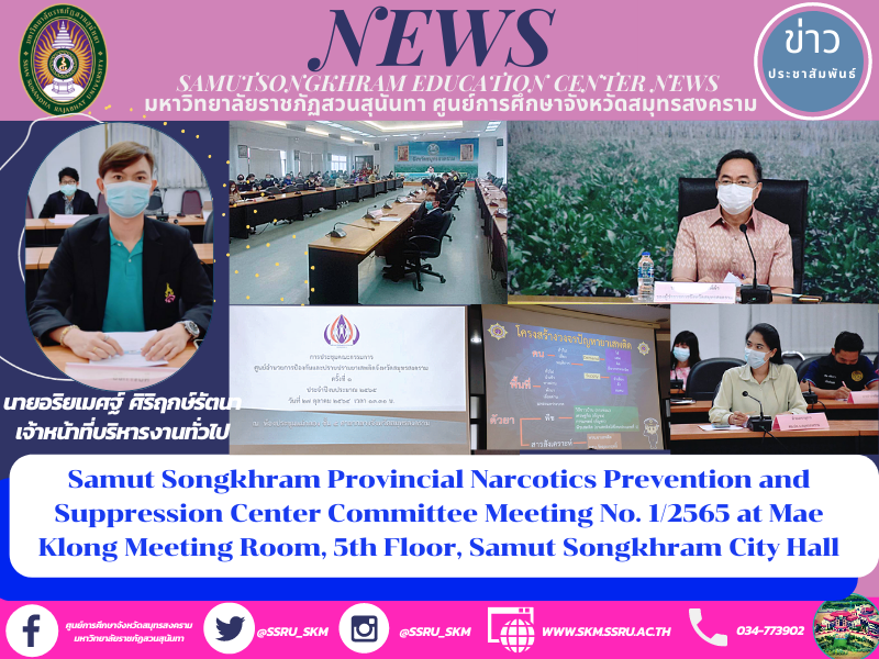 On 27 October 2021, Asst. Prof. Dr. Pimporn Thongmuang, Director of Samut Songkhram Education Center, Suan Sunandha Rajabhat University assigned Mr. Ariyamet Sirireukrattana, General Administration Officer to attend the meeting and report the progress of the drug situation and the performance of the drug prevention and suppression action plan in October 2021 while Mr. Supot Yossingkham, Deputy Governor of Samut Songkhram Province, acting on behalf of the provincial governor, chaired the meeting of the committee of the Provincial Narcotics Prevention and Suppression Center at the 5th floor meeting room, Samut Songkhram City Hall, together with the committee and the Office of the Region 7, and Samut Songkhram Provincial Police that reported the arrests for all drug charges of 40 cases, 2 selling cases, 12 possessions for sale, 11 possessions, 15 drug uses, with total of 1,193 methamphetamine pills, 13.48 grams of ice and 1 ecstasy pill.