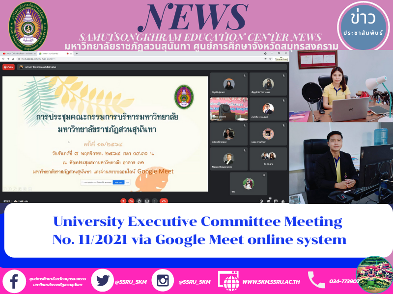 On Monday 8 November 2021 at 09.30 Asst. Prof. Dr. Pimporn Thongmuang, Director of Samut Songkhram Education Center, Suan Sunandha Rajabhat University along with Mr. Eakkachon Noyngern, Chief of the Office participated in the online University Executive Committee Meeting 11/2021 via Google Meet in order to maintain the measures to prevent the spread of the COVID-19 while Prof. Dr. Chutikarn Srivibul, President of Suan Sunandha Rajabhat University presided over the meeting.