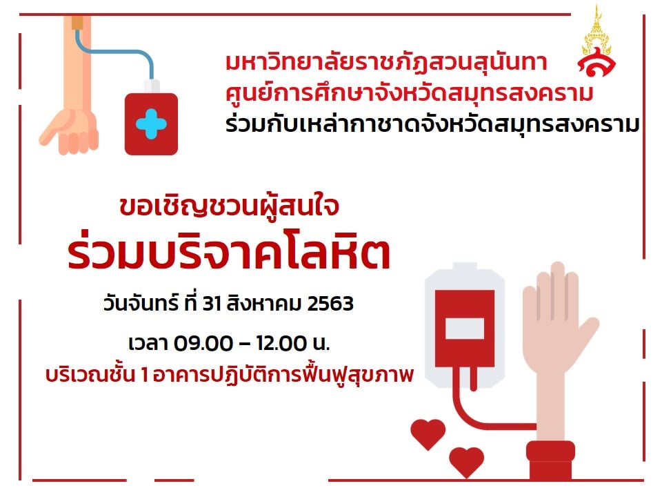 Public relations and inviting administrators, faculty, staff and students to donate blood on Monday August 31, 2020 from 9:00 a.m. - 12:00 p.m. on the 1st floor of the Health Rehabilitation Building. ???????? Preparation before donating blood ... ???? 1–2 days before donating blood should drink lots of water. To keep the body fresh Blood circulation ❌ Do not drink alcoholic beverages. ???? ♀️ Do not play sports or exercise that require heavy sweating. 1 day before donating blood ???????????? Eat food before donating blood for about 4 hours ???? Get enough sleep for at least 6 hours # Modern students # Donate blood # Donate blood #Give blood Equal to giving life #Donate blood to help fellow humans ## Public Relations Samut Songkhram Education Center Suan Sunandha Rajabhat University http://www.skm.ssru.ac.th/