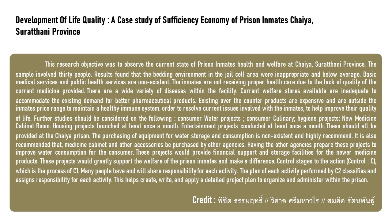 Home > News > > Development Of Life Quality : A Case study of Sufficiency Economy of Prison Inmates Chaiya, Suratthani Province