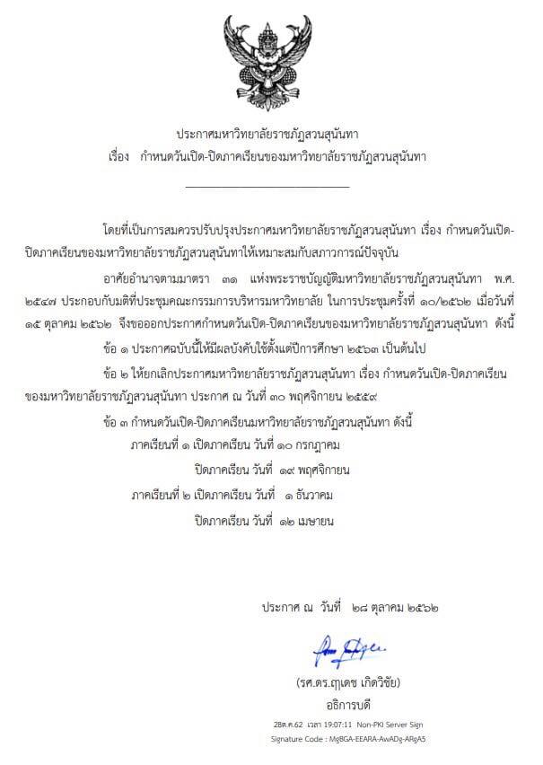 > ประกาศมหาวิทยาลัยราชภัฏสวนสุนันทา เรื่อง กำหนดวันเปิด-ปิดภาคเรียนของมหาวิทยาลัยราชภัฏสวนสุนันทา