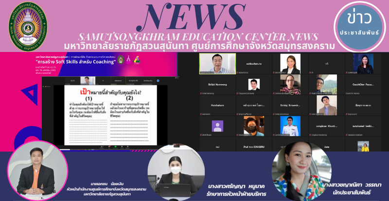 On 5 - 6 January 2022, Asst. Prof. Dr. Pimporn Thongmuang, the Director of Samut Songkhram Education Center, Suan Sunandha Rajabhat University, assigned Mr. Eakkachon Noyngern, Chief of the Office, Ms. Saranya Noonak, Acting Chief of Executive Department, and Ms. Chayanisa Wanna, Public Relations Officer to join the online workshop for Building Soft Skills for Coaching through Zoom Meeting to build problem-solving skills. teamwork, leadership, communication, collaboration, etc.
