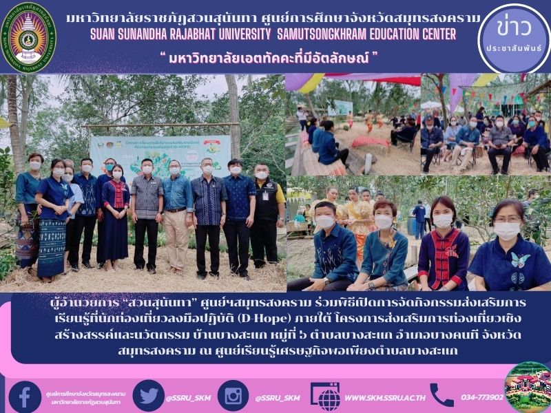 (6 May 65) at 10.30 hrs. Asst. Prof. Dr. Pimporn Thongmuang, Director of Samut Songkhram Provincial Education Center Suan Sunandha Rajabhat University Participated in the opening ceremony of activities promoting learning that tourists do (D-Hope) under the creative and innovative tourism promotion project, Ban Bang Sakae, Village No. 6, Bang Sakae Subdistrict, Bang Khon Tee District, Samut Songkhram Province, at the Sufficiency Economy Learning Center in Bang Sakae Subdistrict by There was Mr. Kajorn Srichawanothai, Governor of Samut Songkhram Province. presided over the opening of the activity The activities are organized by the Samut Songkhram Provincial Community Development Office.