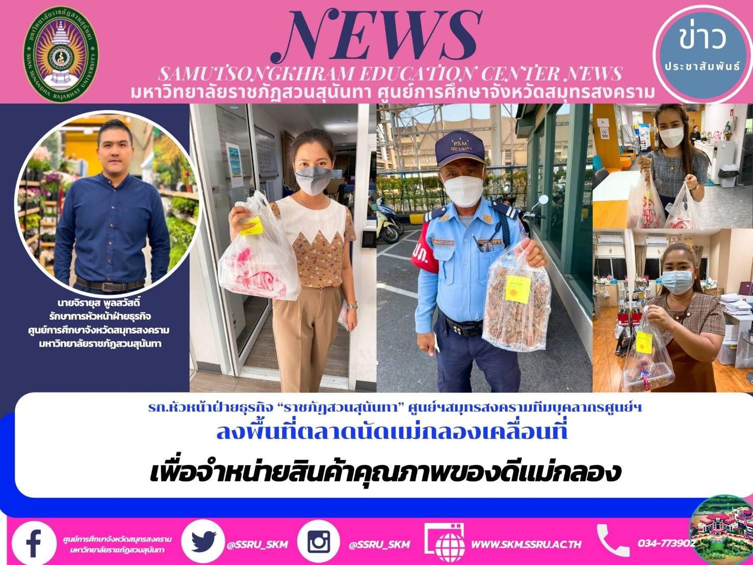 Wednesday, January 19, 2022, Mr. Jirayut Poolsawat, Acting Head of Business Department, Samut Songkhram Province Education Center. Suan Sunandha Rajabhat University Lead the center's personnel team to visit the mobile Maeklong Market area To sell better quality products known as Mae Klong tea, such as Mae Klong Steamed Mackerel, Black Eyed Krapi, Chicken Eggs, Cha-Kram, Coconut Sugar, Mackerel Nut Cookies and many other products taking orders continuously Delivering deliciousness to everyone every Wednesday and Friday at the canal area opposite the College of Nursing and Health Suan Sunandha Rajabhat University