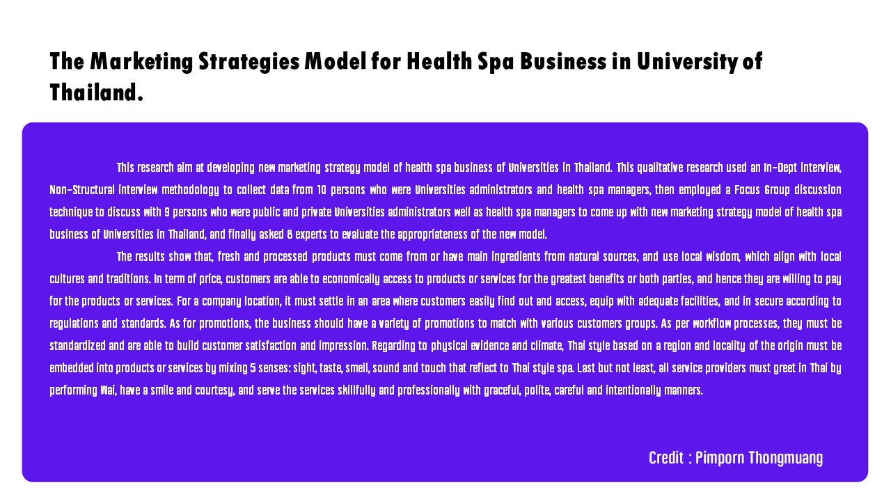 This research aim at developing new marketing strategy model of health spa business of Universities in Thailand. This qualitative research used an In-Dept interview, Non-Structural interview methodology to collect data from 10 persons who were Universities administrators and health spa managers, then employed a Focus Group discussion technique to discuss with 9 persons who were public and private Universities administrators well as health spa managers to come up with new marketing strategy model of health spa business of Universities in Thailand, and finally asked 8 experts to evaluate the appropriateness of the new model.