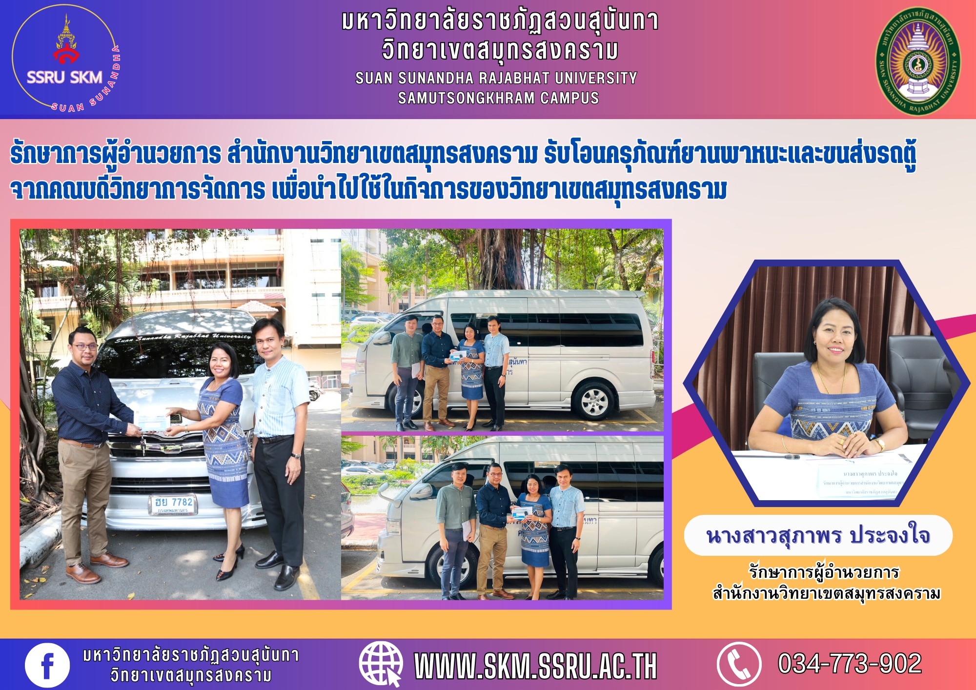On May 26 at 1.00 hrs., Ms. Suporn Prasongjai, Acting Director of Samut Songkhram Campus, received a transfer from Assistant Professor Dr. Somsak Klimsang, Dean of Faculty of Management Science for use in Samut Songkhram Campus at Suan Sunandha Rajabhat University.