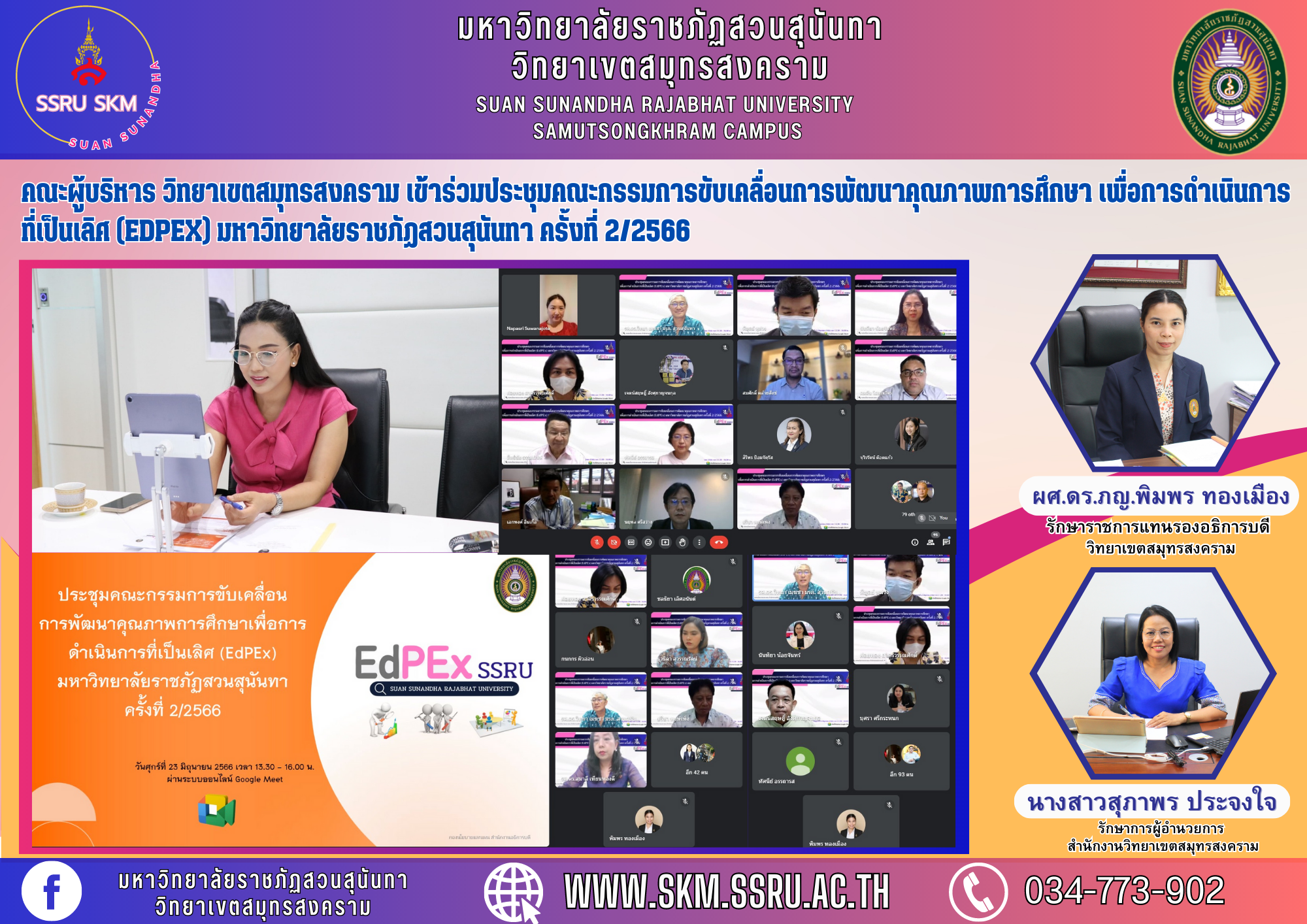 On June 23, 2023 at 1:30 p.m. Asst. Prof. Dr. Pimporn Thongmuang, Acting Vice President for Samut Songkhram Campus together with Ms. Supaporn Prajongjai, Acting Director Samut Songkhram Campus Office Attended the meeting of the Education Quality Development Steering Committee for Implementation Excellence (EdPex), Suan Sunandha Rajabhat University No. 2/2023, with Assoc. via online system Google meet
