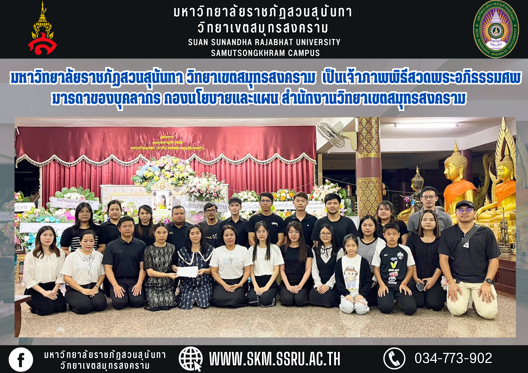 Suan Sunandha Rajabhat University Samut Songkhram Campus, led by Assistant Professor Dr. Pharmacist Pimporn Thongmuang, Vice President of Samut Songkhram Campus, along with Dr. Supaporn Prajongjai, Acting Director of Samut Songkhram Campus Office, Mr. Eakkachon Noi Ngoen, Central Division Director. Samut Songkhram Campus Office and personnel of Samut Songkhram Campus Office/Internal Departments Suan Sunandha Rajabhat University Hosted the funeral prayer ceremony for Mother Chitra Anuwatwimon, mother of Ms. Jutharat Chantai, policy and planning analyst. Policy and Planning Division Samut Songkhram Campus Office Suan Sunandha Rajabhat University