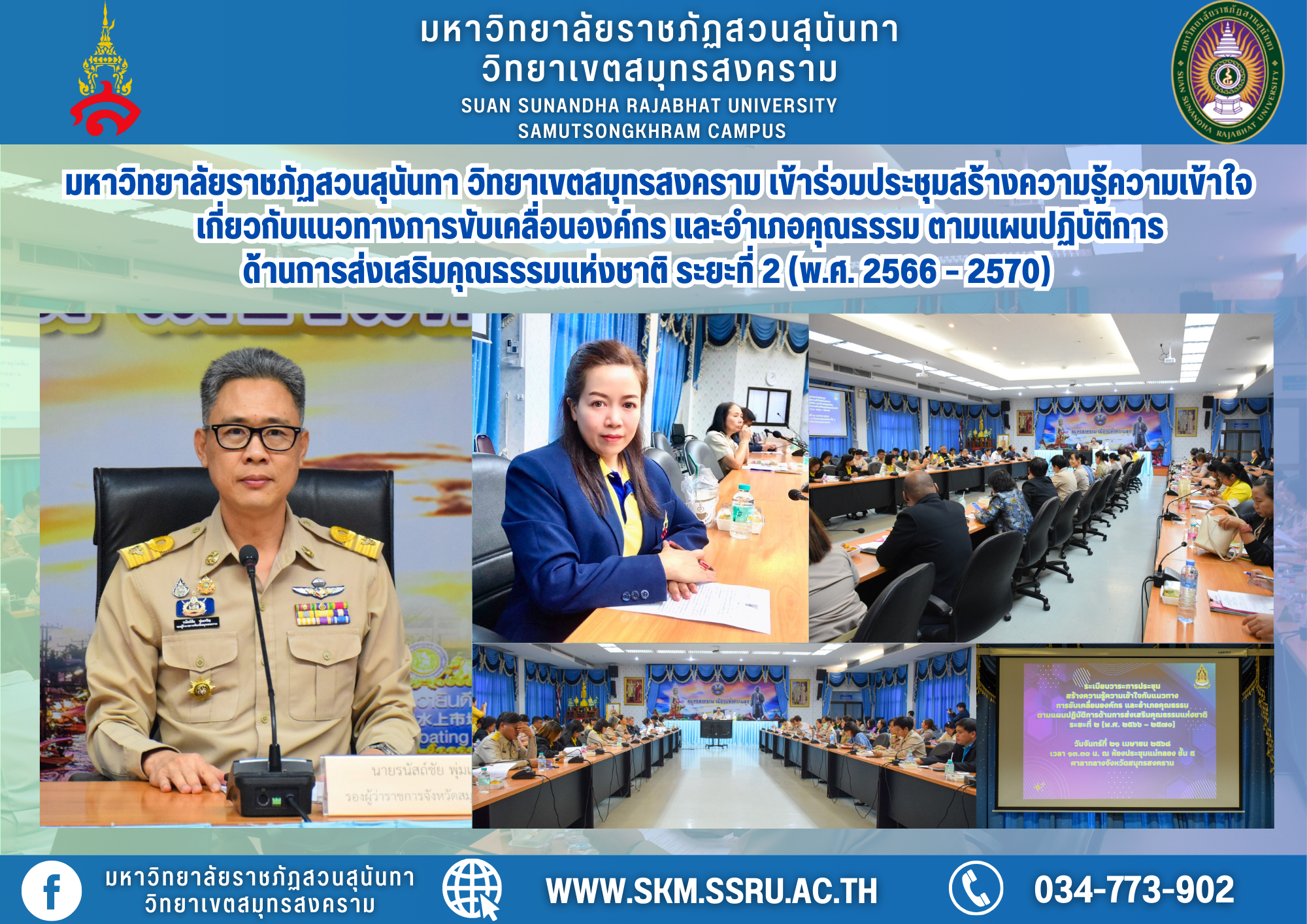 Assistant Professor Dr. Pharmacist Pimporn Thongmuang, Deputy Dean of Samut Songkhram Campus, has assigned Ms. Suphanrai Songwanthai, Acting Head of Building and Facilities Division, Central Division, Samut Songkhram Campus Office, Suan Sunandha Rajabhat University. Participate in the meeting to create knowledge and understanding about the guidelines for driving the organization and the virtuous districts according to the National Virtue Promotion Action Plan, Phase 2 (2023 - 2027)