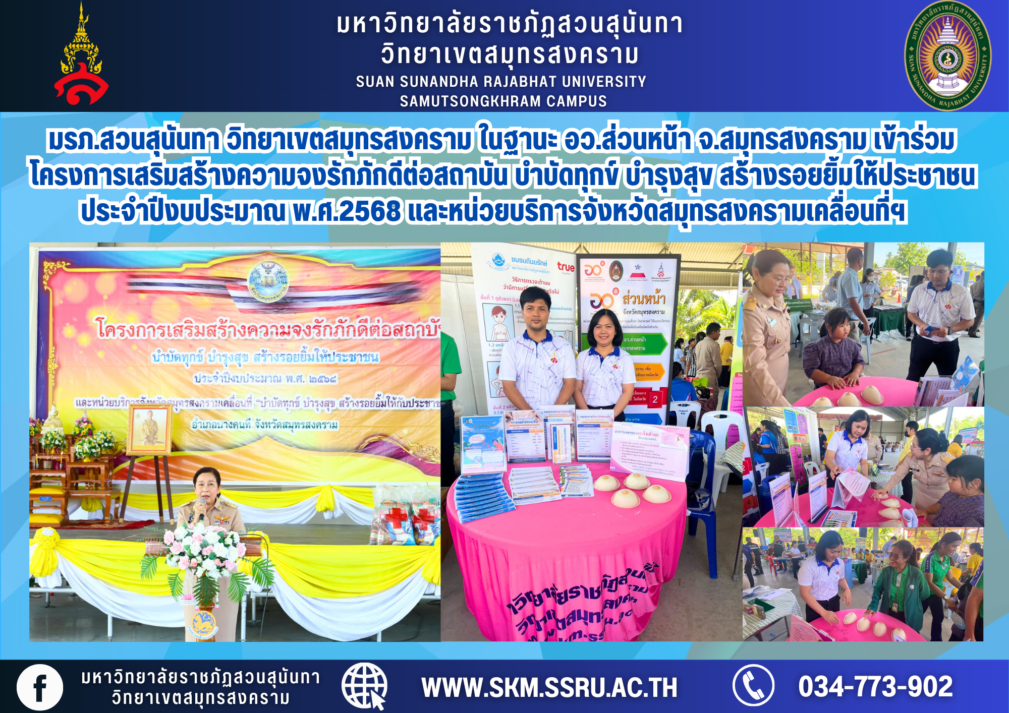 Suan Sunandha Rajabhat University, Samut Songkhram Campus, as the front office of the Ministry of Higher Education in Samut Songkhram Province, led by Assistant Professor Dr. Pharmacist Pimporn Thongmuang, Deputy Rector of Samut Songkhram Campus, has assigned Mr. Surachet Nilsai, an educational specialist and Ms. Patchara Saengnuen, General Administration Officer, Education Division, Samut Songkhram Campus Office, Suan Sunandha Rajabhat University, participated in the project to strengthen loyalty to the institution. Alleviate suffering, promote happiness, and create smiles for the people in the fiscal year 2025 and the mobile service unit of Samut Songkhram Province "Alleviate suffering, promote happiness, and create smiles for the people" (5th time)