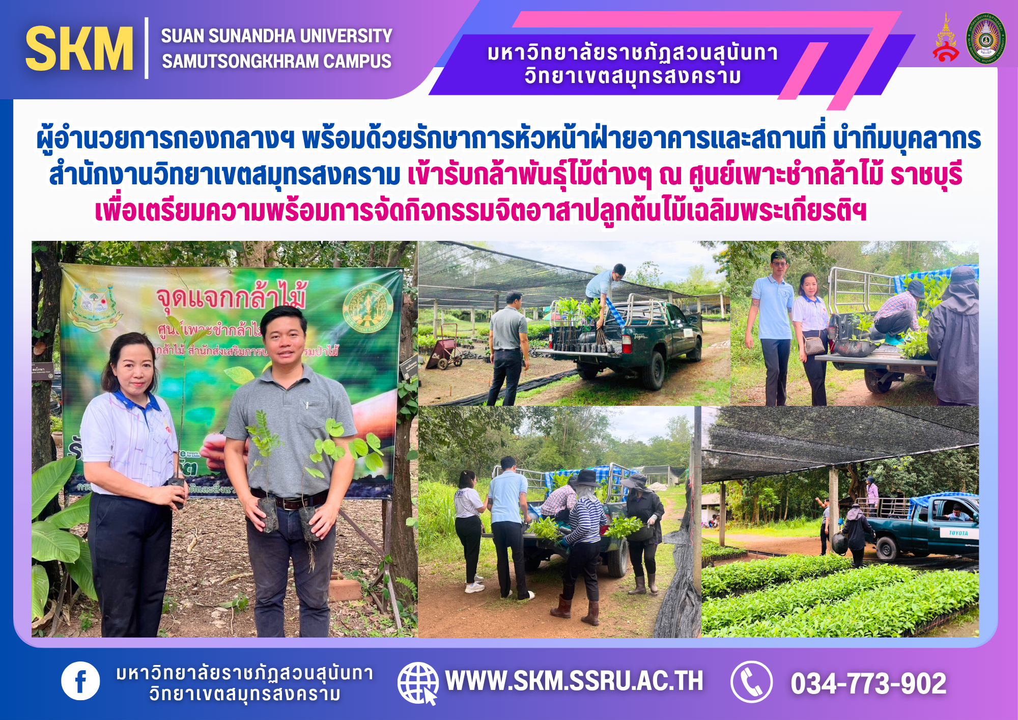 On July 18, 2025, Suan Sunandha Rajabhat University, Samut Songkhram Campus, led by Mr. Ekkachon Noi Ngern, Director of the Central Division, Samut Songkhram Campus Office, along with Ms. Suphanrai Songwanthai, Acting Head of Buildings and Grounds, and Mr. Kritsana Kaewhanam General Administration Officer led a team of personnel from the Buildings and Grounds Department, Samut Songkhram Campus, to receive various types of tree seedlings, such as jackfruit, cassia, and water lilies. To prepare for tree planting in the volunteer tree planting activity in honor of His Majesty King Maha Vajiralongkorn Bodindradebayavarangkun's birthday. His Majesty King Vajiralongkorn Bodindradebayavarangkun, 28 July 2025 at Suan Sunandha Rajabhat University, Samut Songkhram Campus