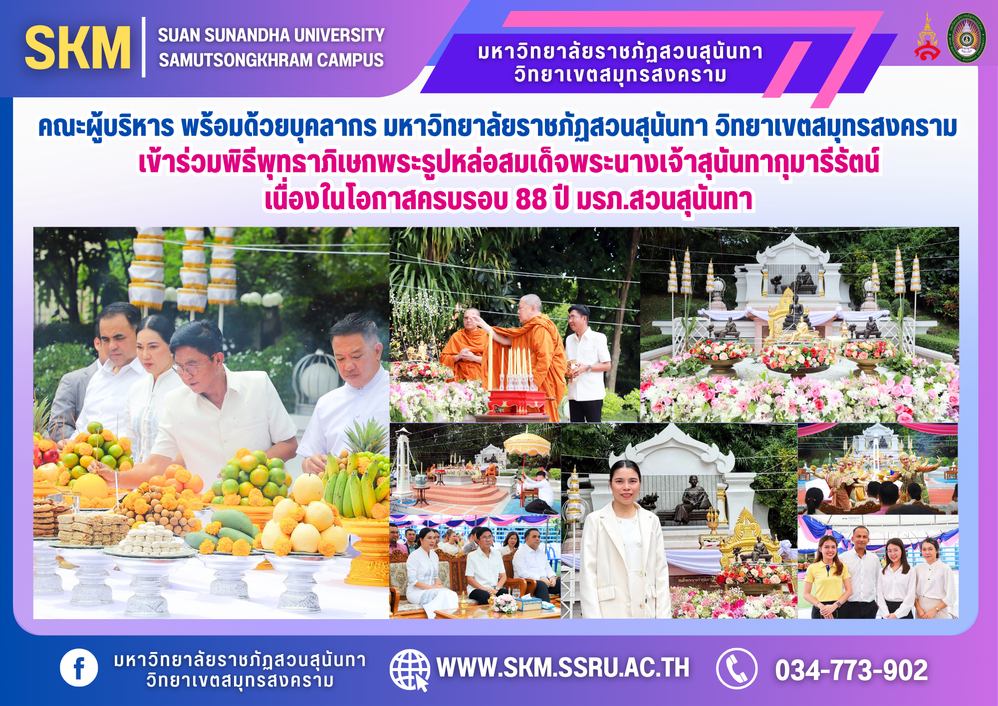 Suan Sunandha Rajabhat University, Samut Songkhram Campus, led by Assistant Professor Dr. Pharmacist Pimporn Thongmuang, Vice President of Samut Songkhram Campus, along with Mr. Ekanarin Piyapanyamonkol, Acting Director of Samut Songkhram Campus Office. and personnel of Samut Songkhram Campus Office participated in the Buddha Abhiseka Ceremony of the statue of Her Majesty Queen Sunandha Kumariratana on the occasion of the 88th anniversary of Suan Sunandha Rajabhat University.