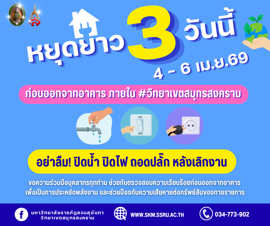 ร่วมกันประหยัดพลังงาน ก่อนออกจากอาคาร อย่าลืม ปิดน้ำ ปิดไฟ และถอดปลั๊กทุกครั้ง✨ ในช่วงวันหยุดยาว 3 วัน (4 - 6 เมษายน 2569)