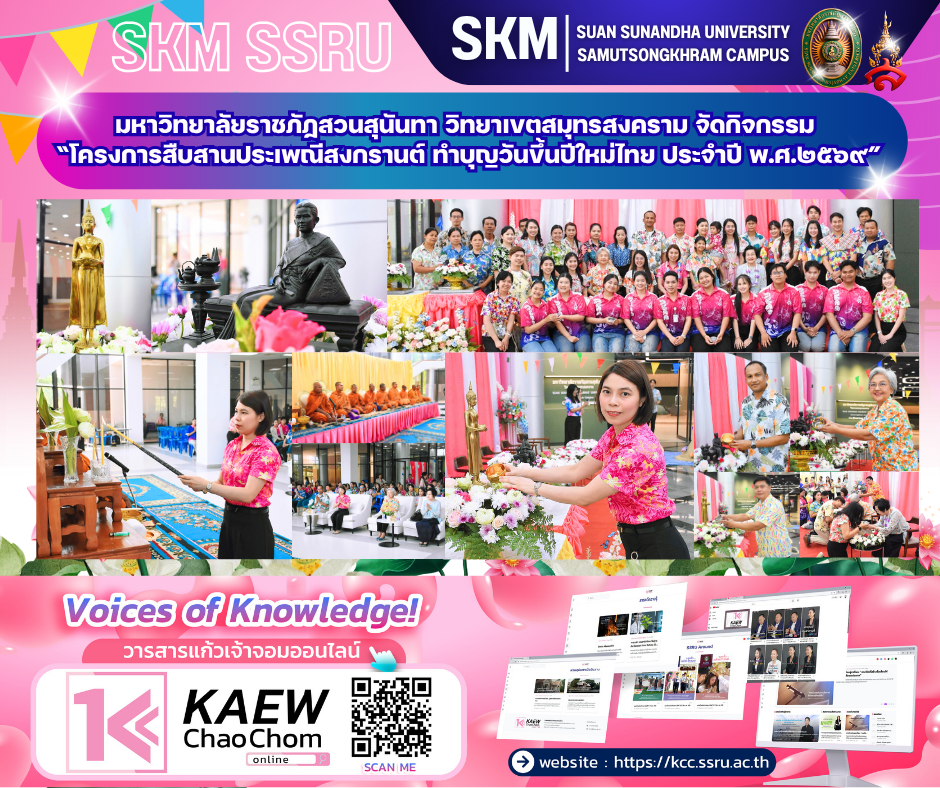 มหาวิทยาลัยราชภัฏสวนสุนันทา วิทยาเขตสมุทรสงคราม นำโดย ผู้ช่วยศาสตราจารย์ ดร. เภสัชกรหญิงพิมพร ทองเมือง รองอธิการบดีวิทยาเขตสมุทรสงคราม พร้อมด้วยนายเอกนรินทร์ ปิยะปัญญามงคล รักษาการในตำแหน่งผู้อำนวยการสำนักงานวิทยาเขตสมุทรสงคราม นายเอกชน น้อยเงิน ผู้อำนวยการกองกลาง สำนักงานวิทยาเขตสมุทรสงคราม หัวหน้าฝ่ายฯ และบุคลากร สำนักงานวิทยาเขตสมุทรสงคราม ร่วมกันจัดกิจกรรม “โครงการสืบสานประเพณีสงกรานต์ ทำบุญวันขึ้นปีใหม่ไทย ประจำปี พ.ศ.๒๕๖๙” เพื่อร่วมอนุรักษ์และสืบสานวัฒนธรรมประเพณีอันดีงามของไทยให้คงอยู่สืบไป