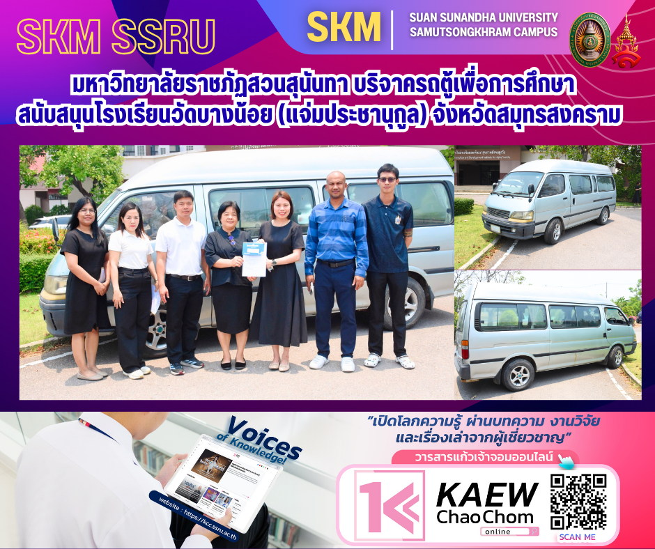 วันจันทร์ที่ 20 เมษายน พ.ศ. 2569 เวลา 12.00 น. มหาวิทยาลัยราชภัฏสวนสุนันทา วิทยาเขตสมุทรสงคราม นำโดย ผู้ช่วยศาสตราจารย์ ดร. เภสัชกรหญิงพิมพร ทองเมือง รองอธิการบดีวิทยาเขตสมุทรสงคราม พร้อมด้วยนายเอกนรินทร์ ปิยะปัญญามงคล รักษาการในตำแหน่งผู้อำนวยการสำนักงานวิทยาเขตสมุทรสงคราม นายเอกชน น้อยเงิน ผู้อำนวยการกองกลาง สำนักงานวิทยาเขตสมุทรสงคราม และบุคลากร สำนักงานวิทยาเขตสมุทรสงคราม ได้ดำเนินการบริจาครถยนต์โดยสาร (รถตู้) ให้แก่โรงเรียนวัดบางน้อย (แจ่มประชานุกูล) เลขที่ 24 หมู่ที่ 4 ตำบลจอมปลวก อำเภอบางคนที จังหวัดสมุทรสงคราม โดยมี นางสาวดุษณีย์ ชลิงสุ ผู้อำนวยการโรงเรียน เป็นผู้รับมอบ