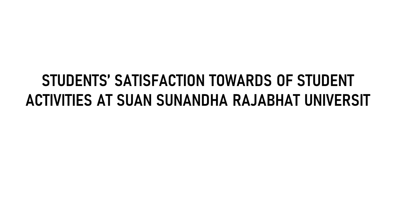 The purposes of this study were 1) study the level of student’s satisfaction towards of activities at Suan Sunandha Rajabhat University in four aspects: academic promoting, arts and culture, sports and volunteer and community service 2)compare student’s satisfaction towards activities at Suan Sunandha Rajabhat University by sex, years of academic achievement, GPA, faculties and governance colleges. The subjects in this study were all under graduated fulltime students in academic year 2011. The number of sample group was 405 students: 45 students from each faculty or college. The data analysis and the comparison of student’s satisfaction towards activities at Suan Sunandha Rajabhat University separated by variable and gender with t-test statistics. To compare students’ satisfaction towards activities at Suan Sunandha Rajabhat University by separating the variables, years of academic achievement, GPA, faculties and governance colleges with one-way ANOVA.