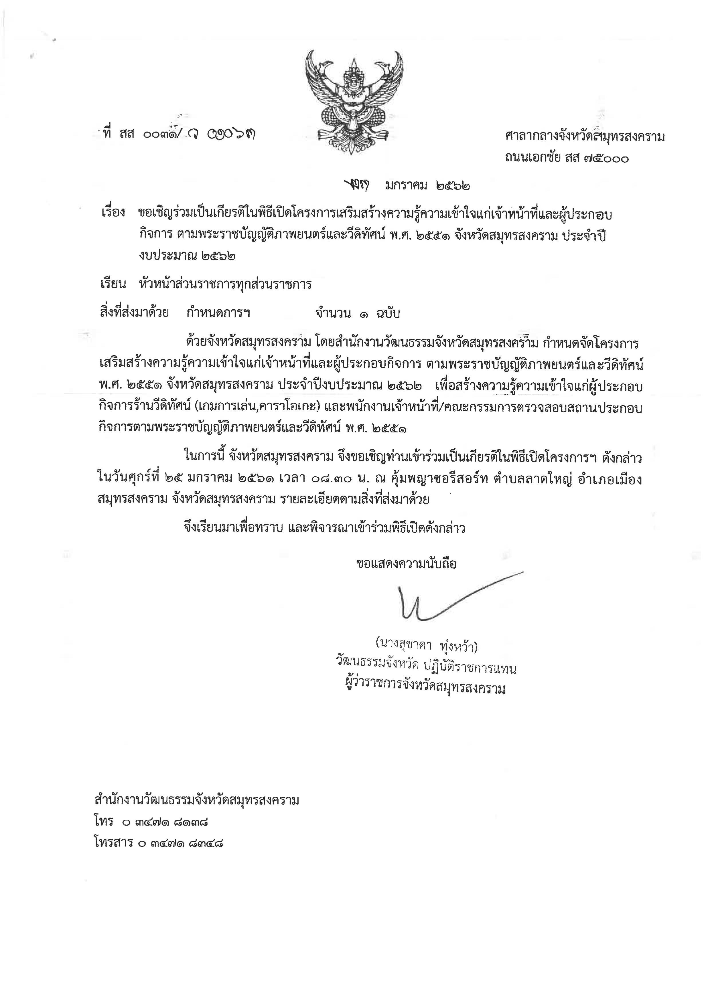 > พิธีเปิดโครงการเสริมสร้างความรู้ความเข้าใจแก่เจ้าหน้าที่และผู้ประกอบกิจการ ตามพระราชบัญญัติภาพยนตร์และวีดิทัศน์ พ.ศ. ๒๕๕๑ จังหวัดสมุทรสงคราม ประจำปี งบประมาณ ๒๕๖๒