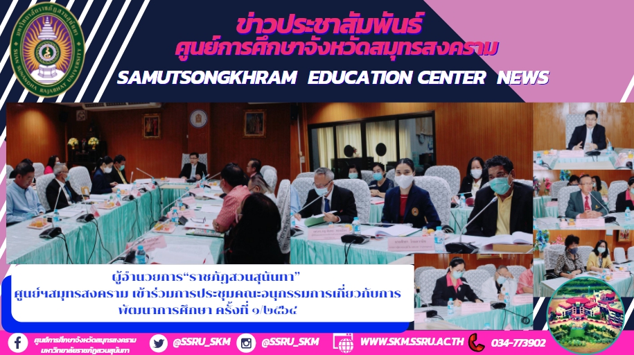 วันที่ ๑๖ กุมภาพันธ์ ๒๕๖๔ ณ ห้องประชุมเสมาสมุทร ชั้น ๑ สำนักงานศึกษาธิการจังหวัดสมุทรสงคราม ผศ.ดร.พิมพร ทองเมือง ผู้อำนวยการศูนย์การศึกษาจังหวัดสมุทรสงคราม มหาวิทยาลัยราชภัฏสวนสุนันทา เข้าร่วมประชุมคณะกรรมการเกี่ยวกับการพัฒนาการศึกษา ครั้งที่ ๑/๒๕๖๔ โดยมี นายสมโภชน์ เศรษฐาวงศ์ ผู้แทนสำนักงานคณะกรรมการศึกษาขั้นพื้นฐาน เป็นประธานในที่ประชุม พร้อมด้วย คณะอนุกรรมการฯเข้าร่วมประชุมโดยพร้อมเพรียงกัน