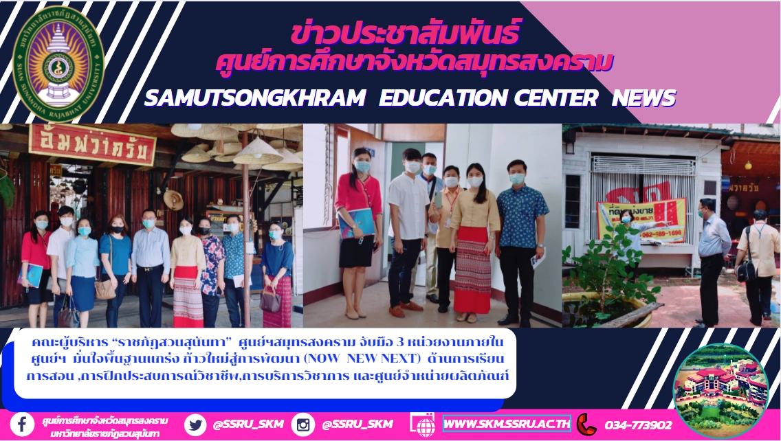 (19 ก.พ.63) ผู้ช่วยศาสตราจารย์.ดร.ภญ.พิมพร ทองเมือง ผู้อำนวยการศูนย์การศึกษาจังหวัดสมุทรสงคราม มหาวิทยาลัยราชภัฏสวนสุนันทา พร้อมด้วยนายเอกชน น้อยเงิน หัวหน้าสำนักงานศูนย์การศึกษาจังหวัดสมุทรสงคราม ร่วมกับรองศาสตราจารย์.ดร.สมเดช รุ่งศรีสวัสดิ์ คณบดีวิทยาลัยสหเวชศาสตร์ และผู้ช่วยศาสตราจารย์ ดร. สุจิตรา อู่รัตนมณี ผู้อำนวยการศูนย์แห่งความเป็นเลิศในการดูแลผู้สูงอายุ และคณาจารย์ ลงพื้นที่สำรวจสถานที่ ณ บริเวณตลาดน้ำอัมพวา อำเภออัมพวา จังหวัดสมุทรสงคราม เพื่อเตรียมความพร้อมในการรองรับการจัดการเรียนการสอน ฝึกประสบการณ์วิชาชีพ บริการวิชาการ และศูนย์จำหน่ายผลิตภัณฑ์ในนามศูนย์การศึกษาจังหวัดสมุทรสงคราม มหาวิทยาลัยราชภัฏสวนสุนันทา ในอนาคตอันใกล้นี้