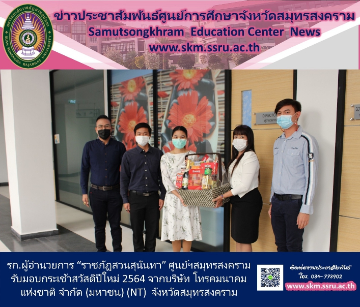 วันจันทร์ที่ 20 มกราคม 2564 เวลา 10.00 น. ผศ.ดร.ภญ.พิมพร ทองเมือง รักษาการผู้อำนวยการ ศูนย์การศึกษาจังหวัดสมุทรสงคราม มหาวิทยาลัยราชภัฏสวนสุนันทา พร้อมนายเอกชน น้อยเงิน หัวหน้าสำนักงาน นายจิรายุส พูลสวัสดิ์ รักษาการหัวหน้าฝ่ายธุรกิจ และนายอริยเมศฐ์ ศิริฤกษ์รัตนา รับมอบกระเช้าอวยพร จากบริษัท โทรคมนาคมแห่งชาติ จำกัด (มหาชน) (NT) จังหวัดสมุทรสงคราม โดยมี คุณพิมชญาณัฐ จงสกุล ผู้จัดการศูนย์การขายและลูกค้าสัมพันธ์ จากบริษัท โทรคมนาคมแห่งชาติ จำกัด (มหาชน) (NT) จังหวัดสมุทรสงคราม เป็นผู้แทนบริษัทฯ เดินทางมาเพื่อมอบกระเช้าในครั้งนี้ เนื่องในโอกาสเทศกาลปีใหม่ 2564 ณ บริเวณ ชั้น 5 อาคารอาคารปฏิบัติการฟื้นฟูสุขภาพ