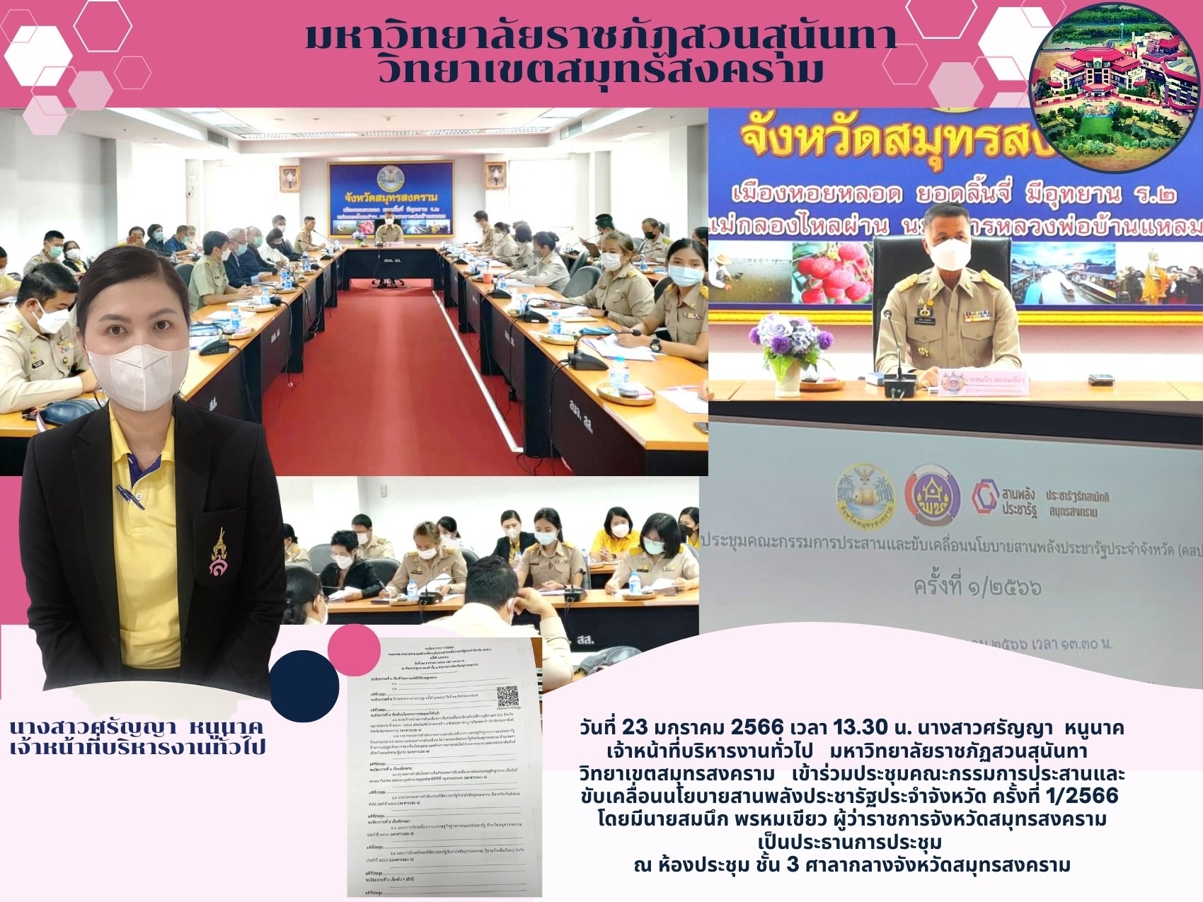 วันที่ 23 มกราคม 2566 เวลา 13.30 น. นางสาวศรัญญา หนูนาค เจ้าหน้าที่บริหารงานทั่วไป มหาวิทยาลัยราชภัฏสวนสุนันทา วิทยาเขตสมุทรสงคราม เข้าร่วมประชุมคณะกรรมการประสานและขับเคลื่อนนโยบายสานพลังประชารัฐประจำจังหวัด ครั้งที่ 1/2566 โดยมีนายสมนึก พรหมเขียว ผู้ว่าราชการจังหวัดสมุทรสงคราม เป็นประธานการประชุม ณ ห้องประชุม ชั้น 3 ศาลากลางจังหวัดสมุทรสงคราม