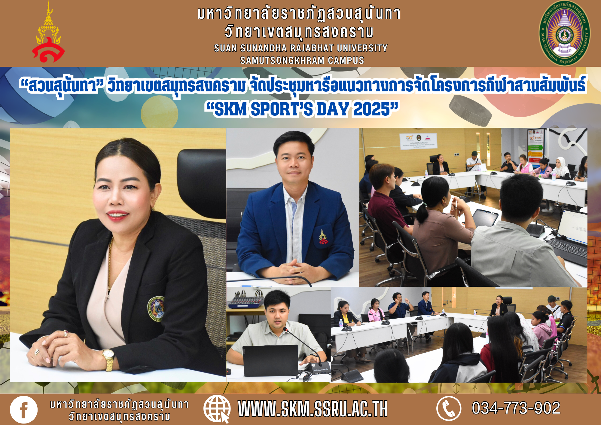 ดร.สุภาพร ประจงใจ รักษาการผู้อำนวยการสำนักงานวิทยาเขตสมุทรสงคราม เป็นประธานในการประชุมฯ พร้อมด้วยนายเอกชน น้อยเงิน ผู้อำนวยการกองกลาง สำนักงานวิทยาเขตสมุทรสงคราม นำทีมบุคลากร สำนักงานวิทยาเขตสมุทรสงคราม/บุคลากร หน่วยงานภายในกำกับ และนักศึกษา มหาวิทยาลัยราชภัฏสวนสุนันทา วิทยาเขตสมุทรสงคราม เข้าร่วมประชุมหารือเพื่อวางแนวทางการจัดโครงการกีฬาสานสัมพันธ์ “SKM Sport’s Day 2025” โดยมีวัตถุประสงค์เพื่อเป็นการให้นักศึกษามีภาวะความเป็นผู้นำ เสียสละ กล้าคิด กล้าแสดงออก อีกทั้งยังเป็นการสนับสนุนให้นักศึกษาใช้เวลาว่างให้เกิดประโยชน์ มีสุขภาพจิต สุขภาพกายที่ดี และเป็นการสร้างความสัมพันธ์อันดีระหว่างคณาจารย์ บุคลากร และนักศึกษา ภายในวิทยาเขตสมุทรสงคราม