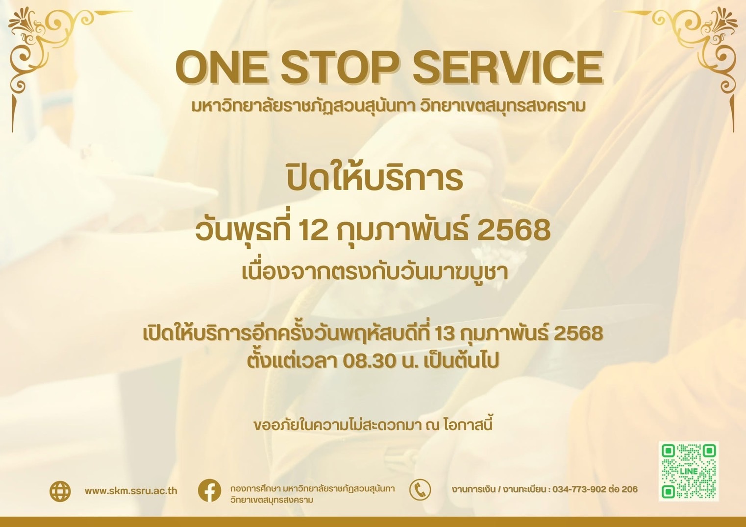 > ONE STOP SERVICE มหาวิทยาลัยราชภัฏสวนสุนันทา วิทยาเขตสมุทรสงคราม ปิดให้บริการเนื่องในวันมาฆบูชา