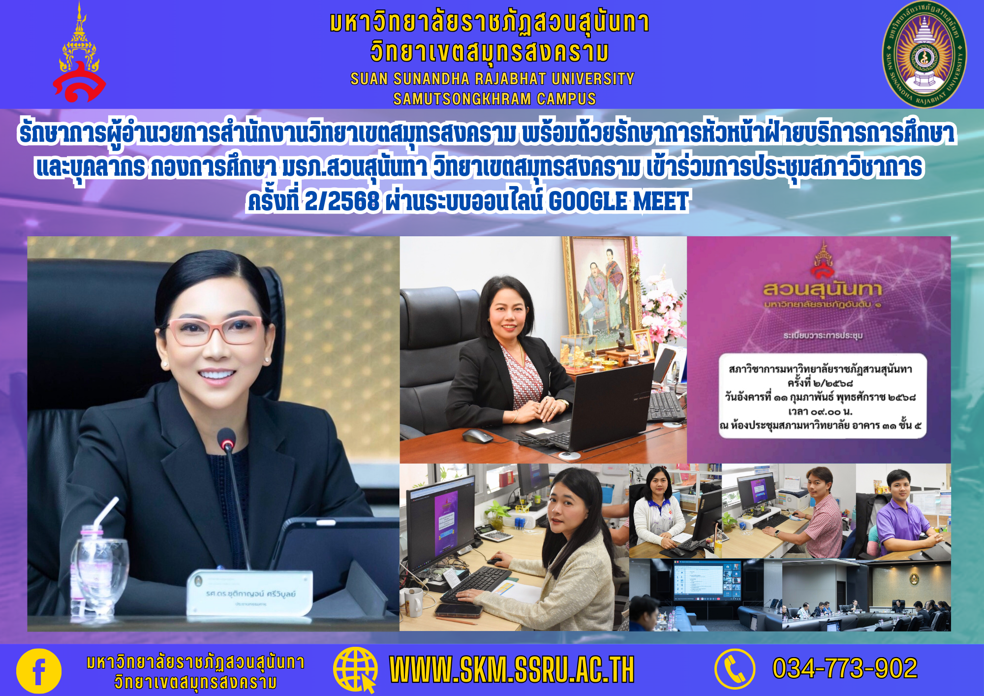 การประชุมฯ ดังกล่าว จัดขึ้น ณ ห้องประชุมสภามหาวิทยาลัย ชั้น 5 อาคาร 31 มหาวิทยาลัยราชภัฏสวนสุนันทา และเป็นการประชุมในรูปแบบออนไลน์ ผ่านโปรแกรม Google Meet